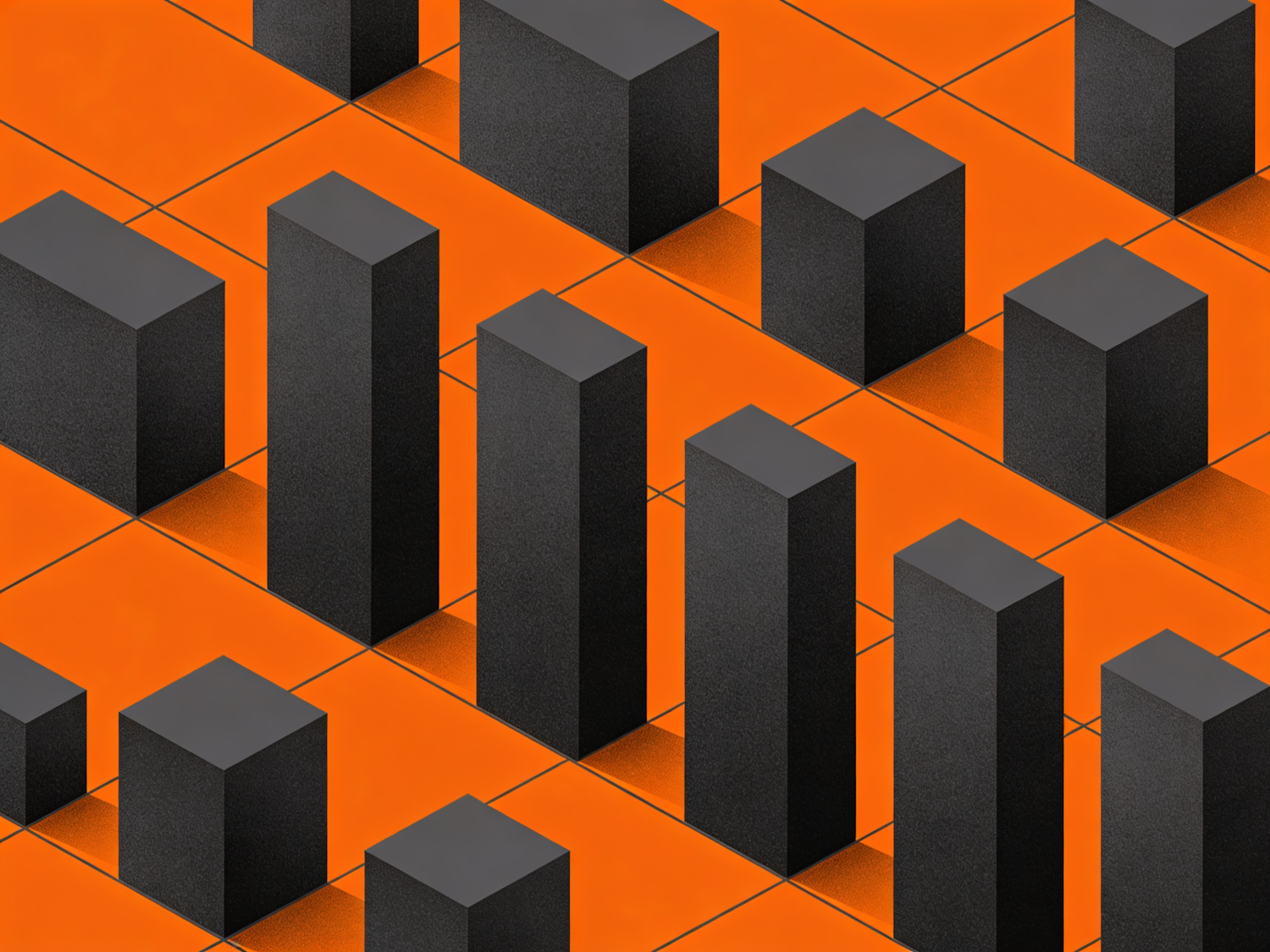 A striking geometric design with black prisms on an orange grid, showcasing depth and contrast in a modern, abstract style.