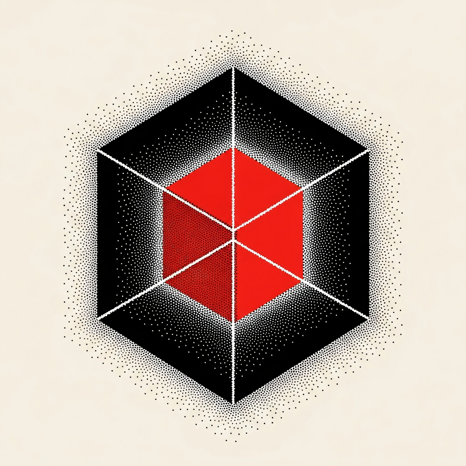A striking geometric illustration with a red cube at the center of a black and white dotted hexagonal structure on a beige background.