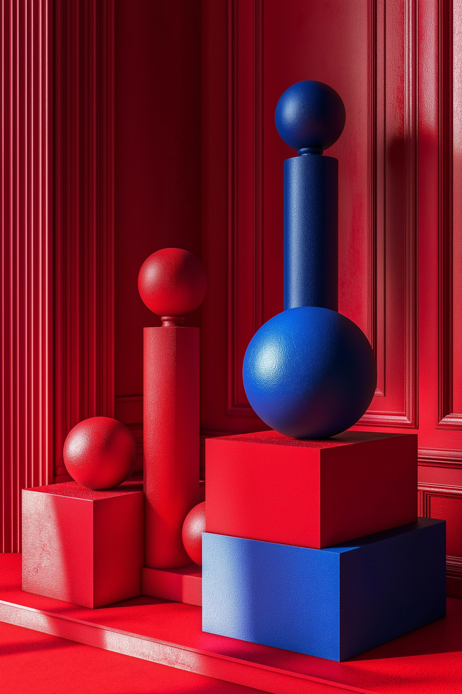 Vibrant geometric shapes in red and blue create a bold, modern composition with striking color contrast and depth.