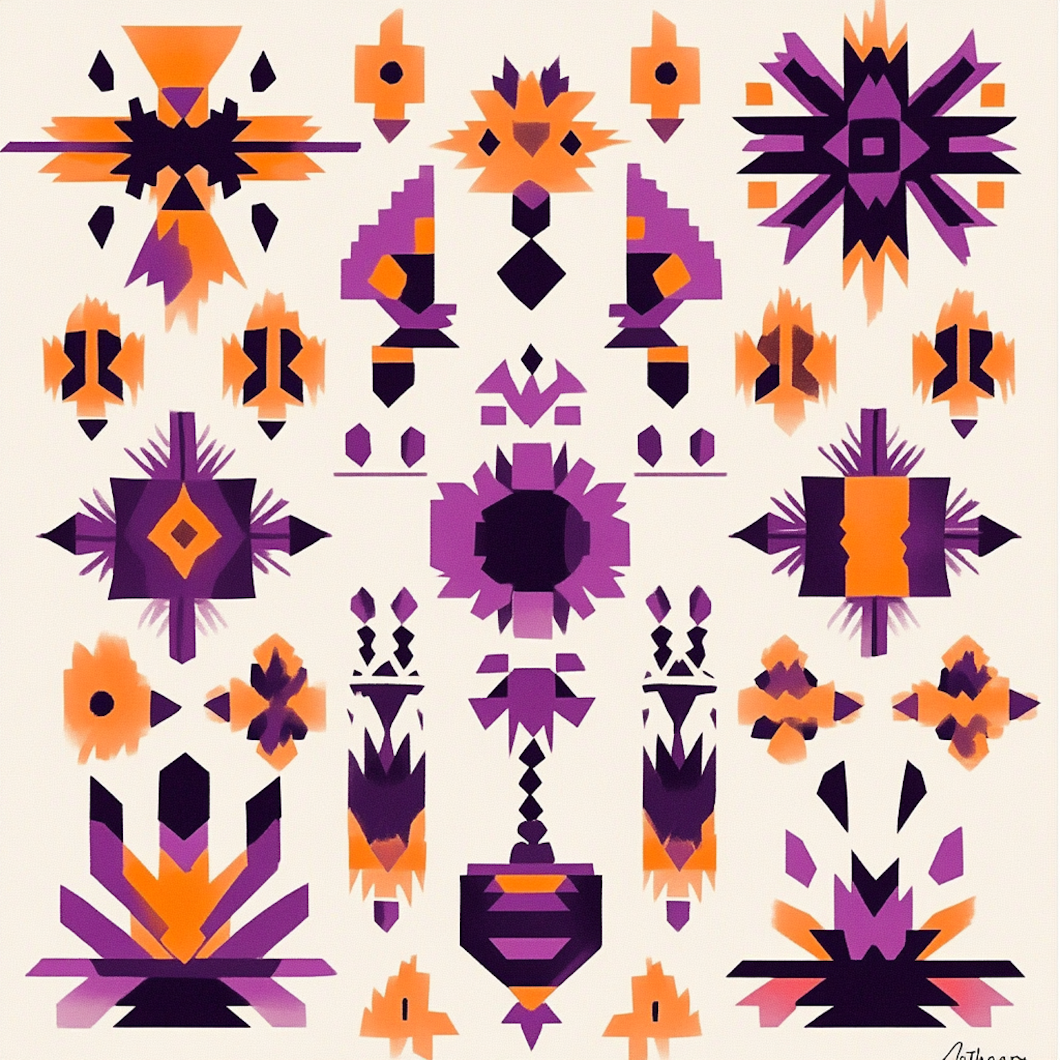 Vibrant geometric pattern with purple, orange, and black shapes on a light background, creating a striking symmetrical design.