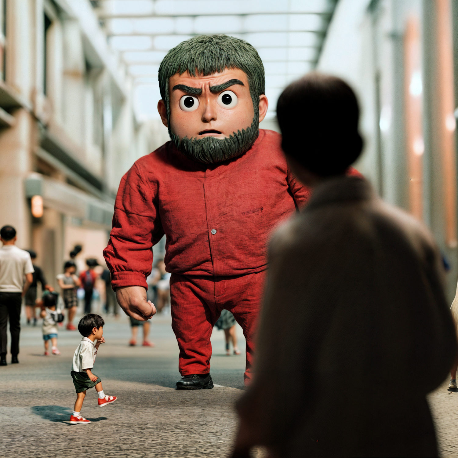 A giant cartoonish figure in a red jumpsuit towers over a busy street, with a curious child in red sneakers looking up at it.