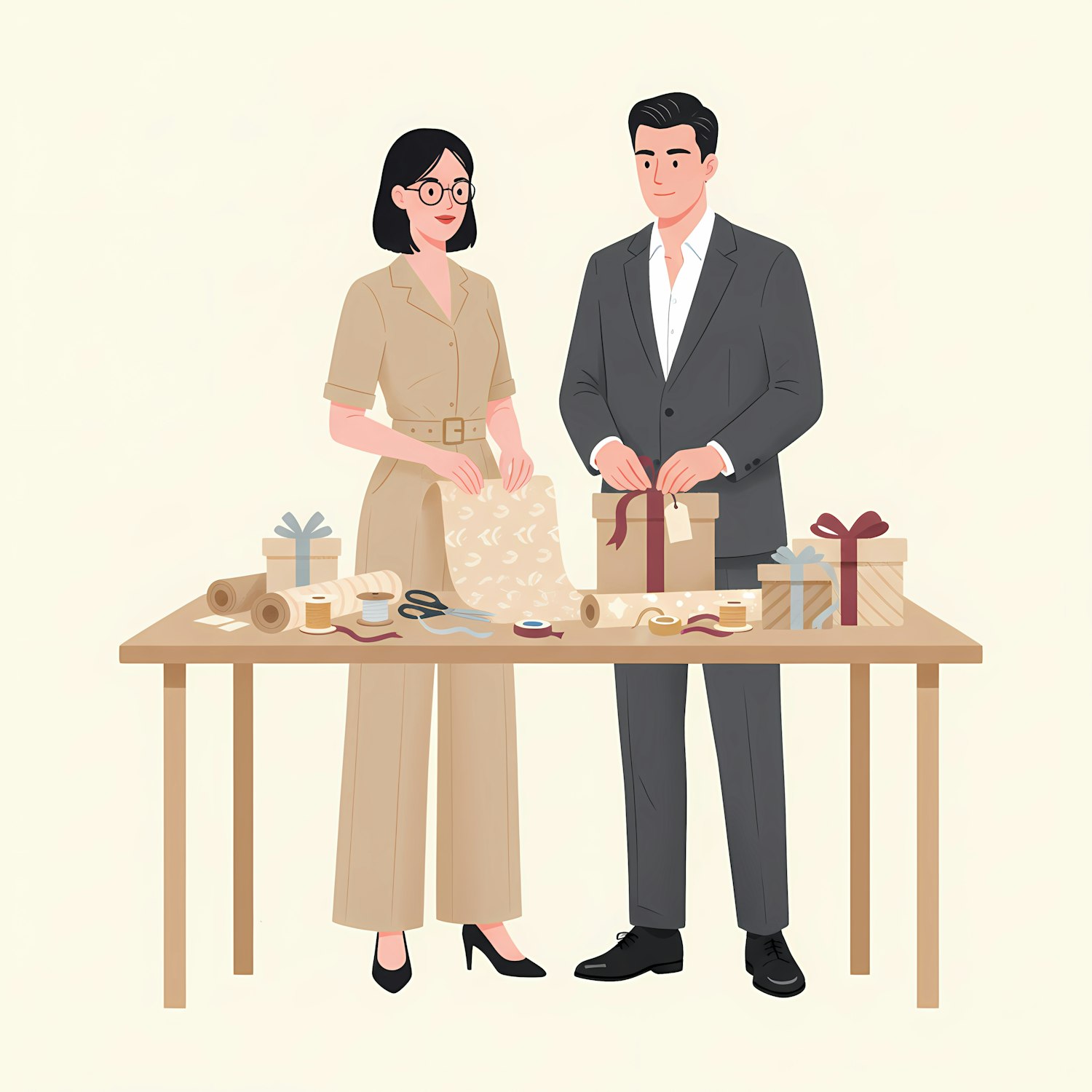 A man and woman wrap gifts at a table with supplies, showcasing teamwork and creativity in a clean, minimalistic setting.