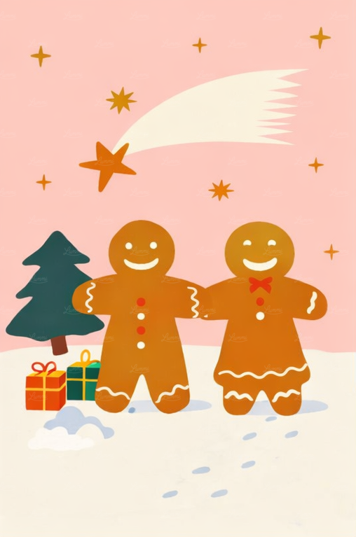Two gingerbread figures stand together on snow, with a Christmas tree, presents, and a shooting star in a festive pink sky.