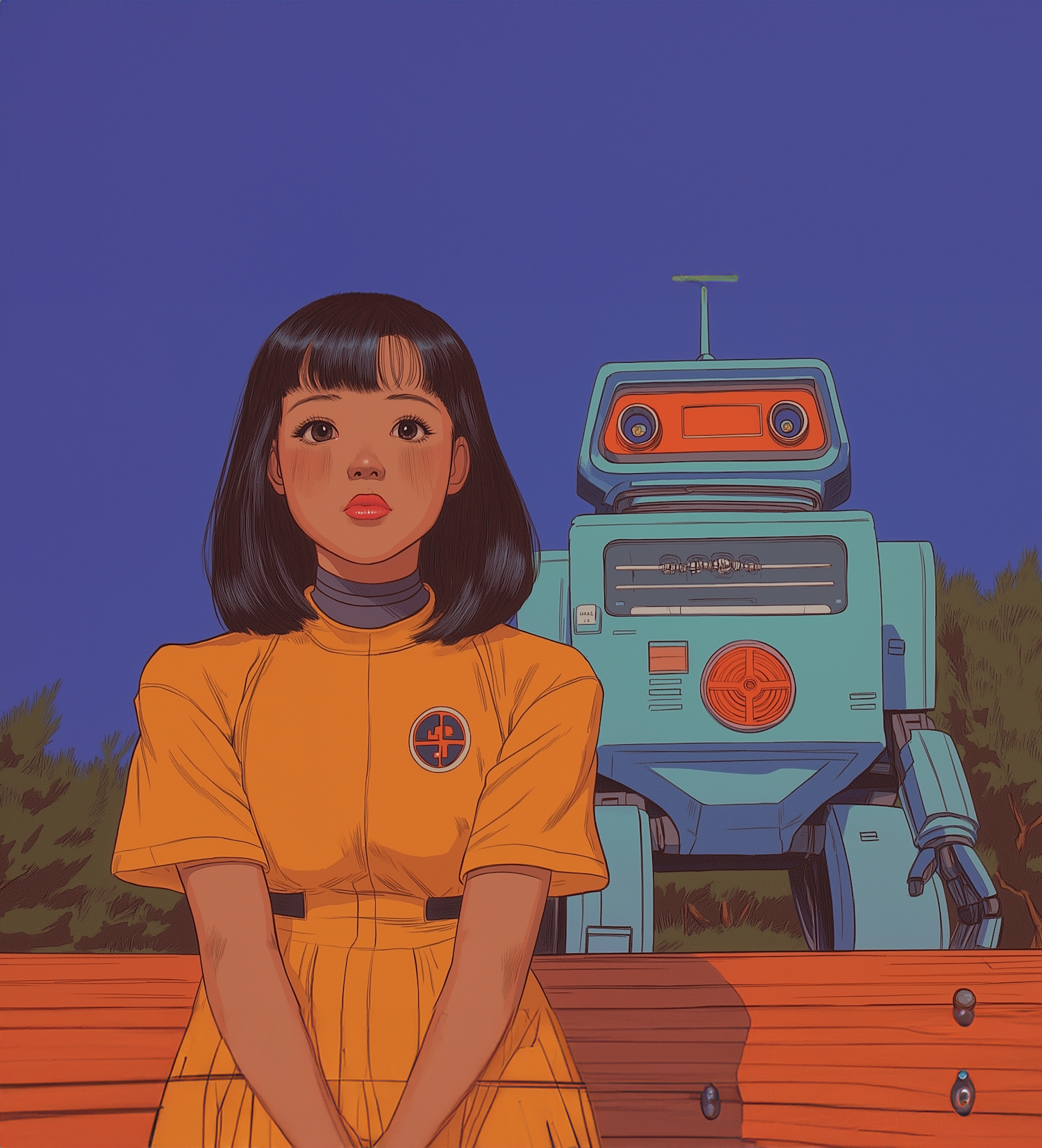 Illustration of an Asian girl in an orange dress sitting with a retro robot against a blue sky. Vibrant colors and serene expression.