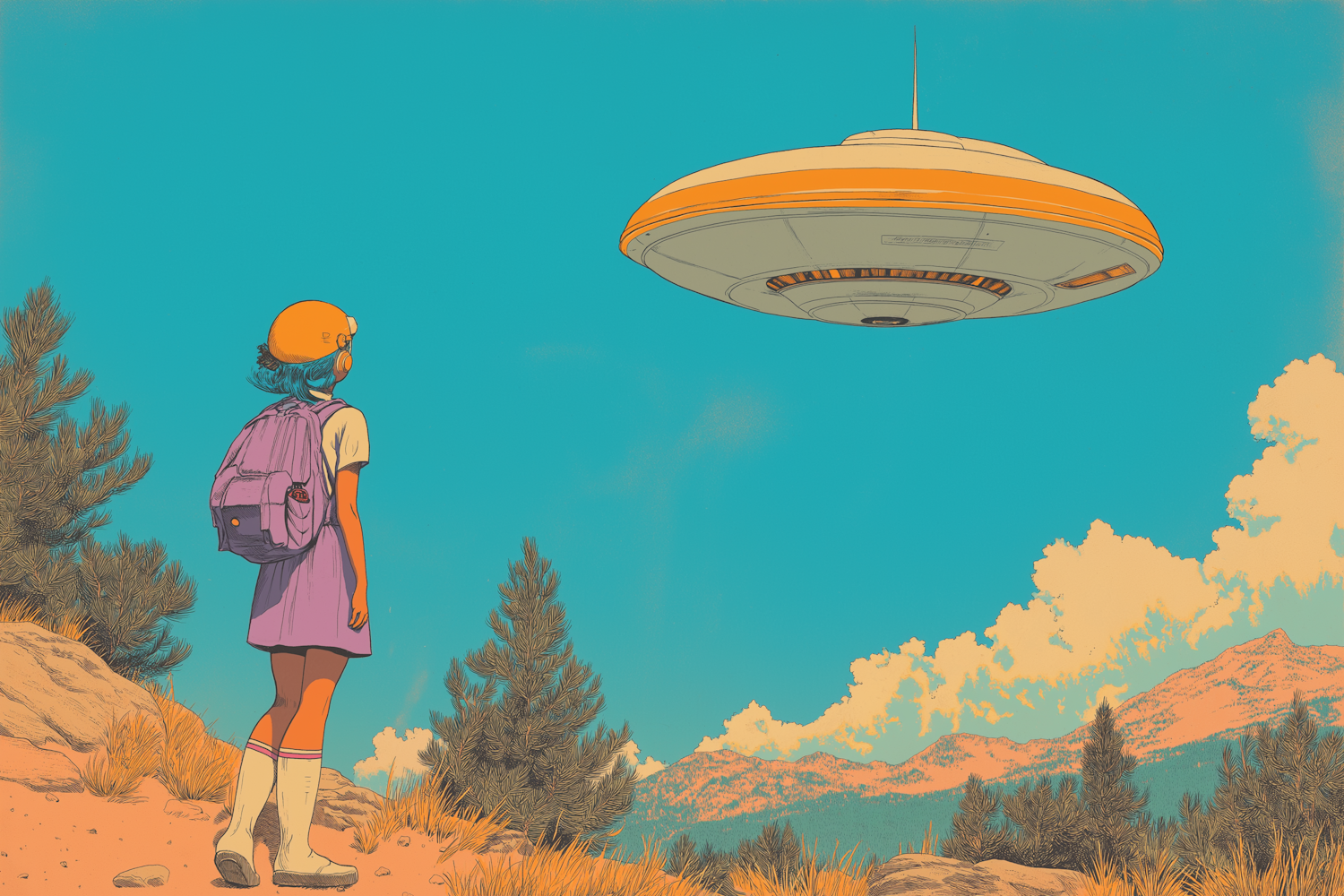 A young girl in a helmet and backpack gazes at a UFO in a vibrant blue sky, surrounded by pine trees and mountains.