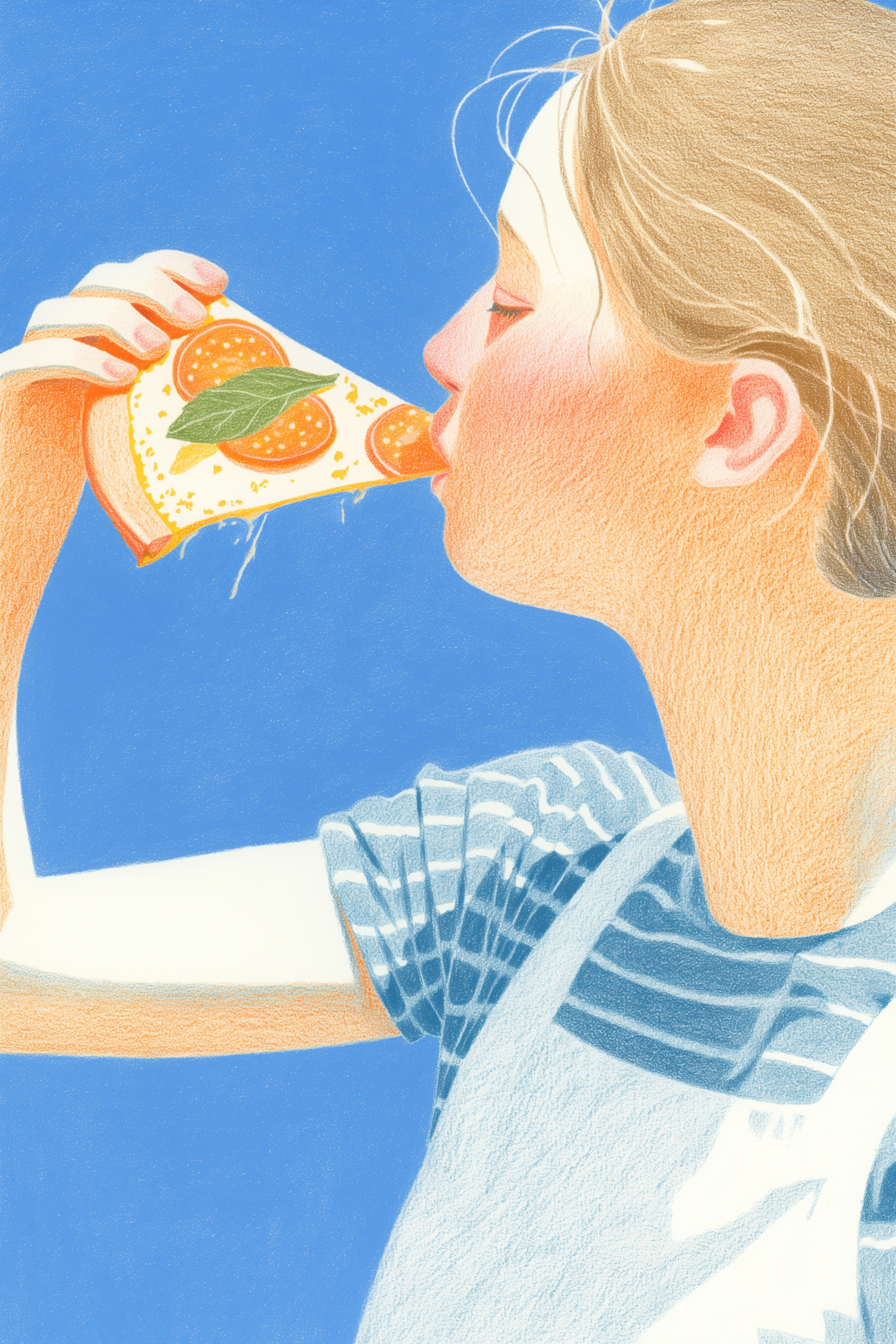 Illustration of a girl enjoying a slice of pizza against a bright blue background, with a focus on vibrant colors and textures.