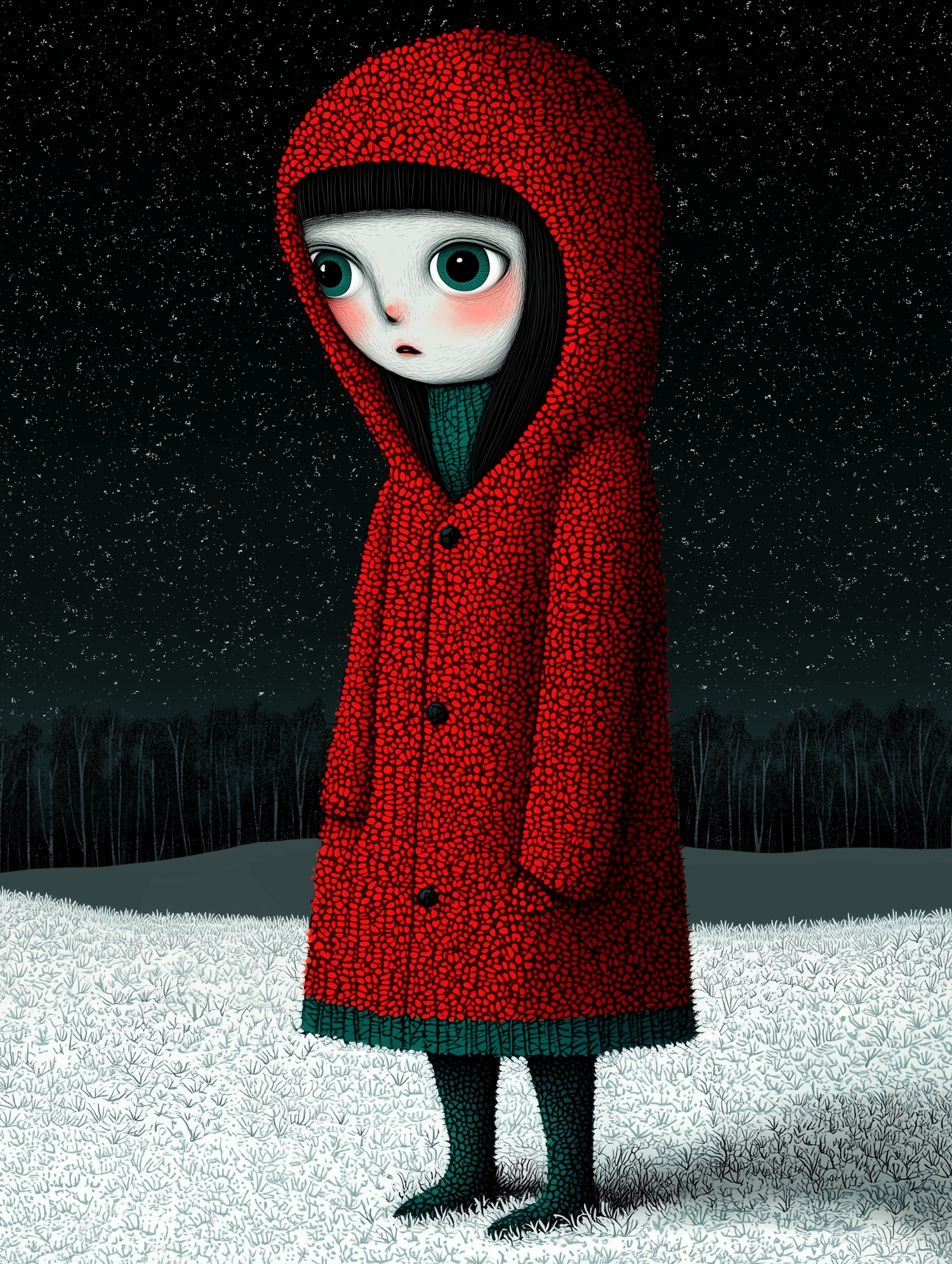 Surreal illustration of a girl in a red hooded coat standing in snow under a starry sky, evoking mystery and melancholy.