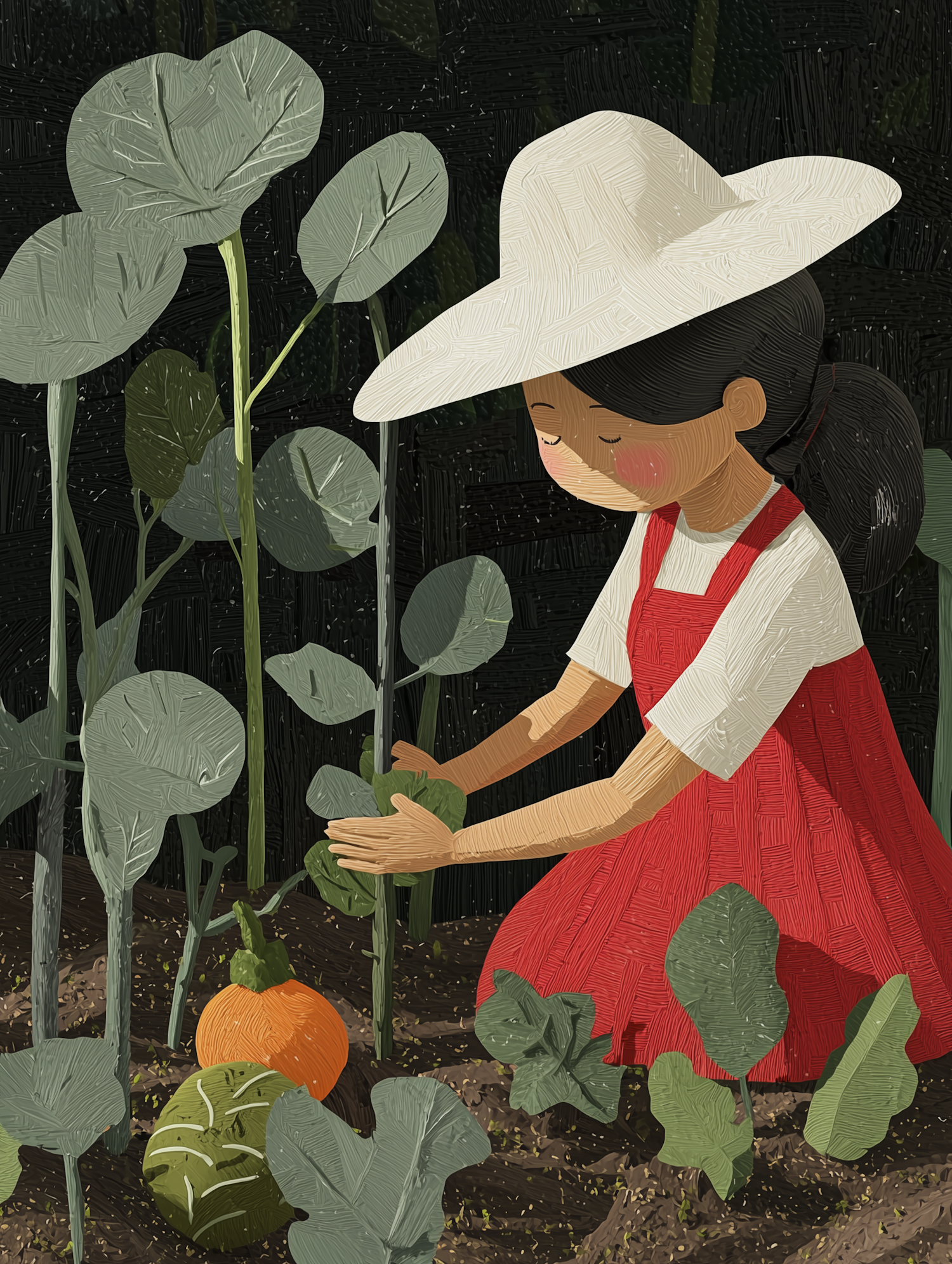 A young girl in a red dress tends to a garden with pumpkins and large green leaves, wearing a wide-brimmed white hat.