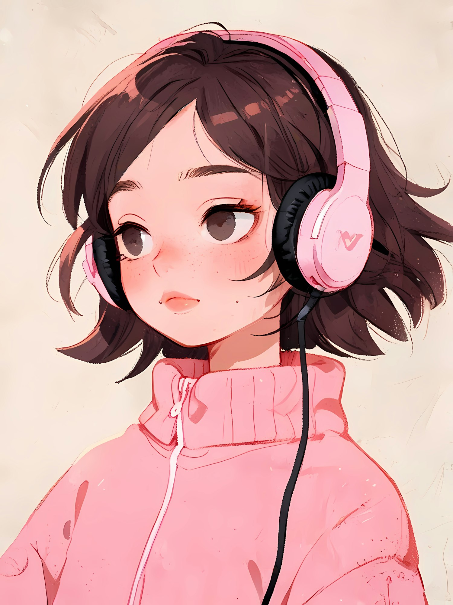 Cute digital illustration of a girl with pink headphones and a cozy pink sweater, perfect for fans of soft, painterly art styles.