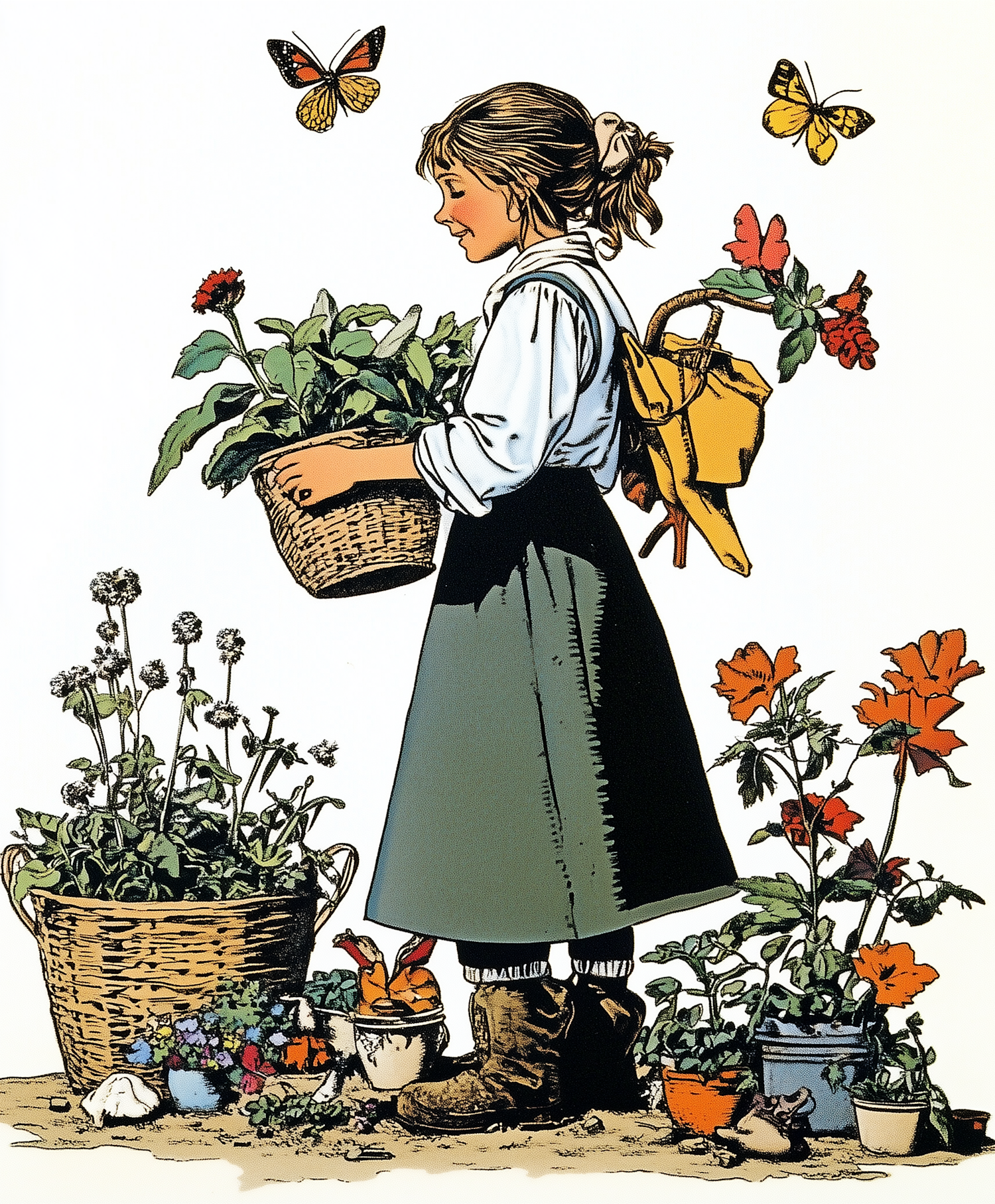 A young girl in a garden holds a basket of plants, surrounded by colorful flowers and butterflies, evoking a sense of nature's beauty.