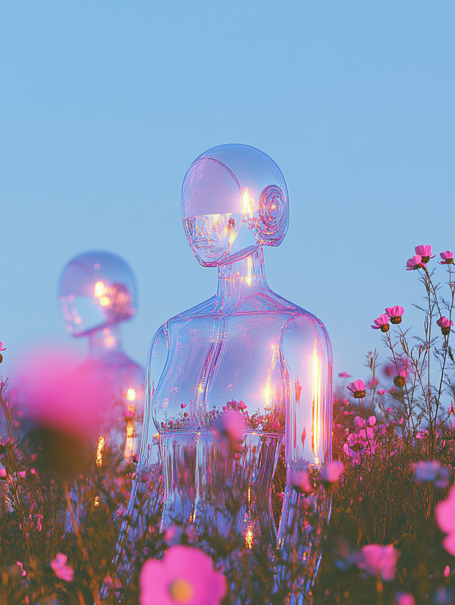 Transparent humanoid figures in a field of pink flowers, reflecting sunset light. A blend of nature and futuristic design.