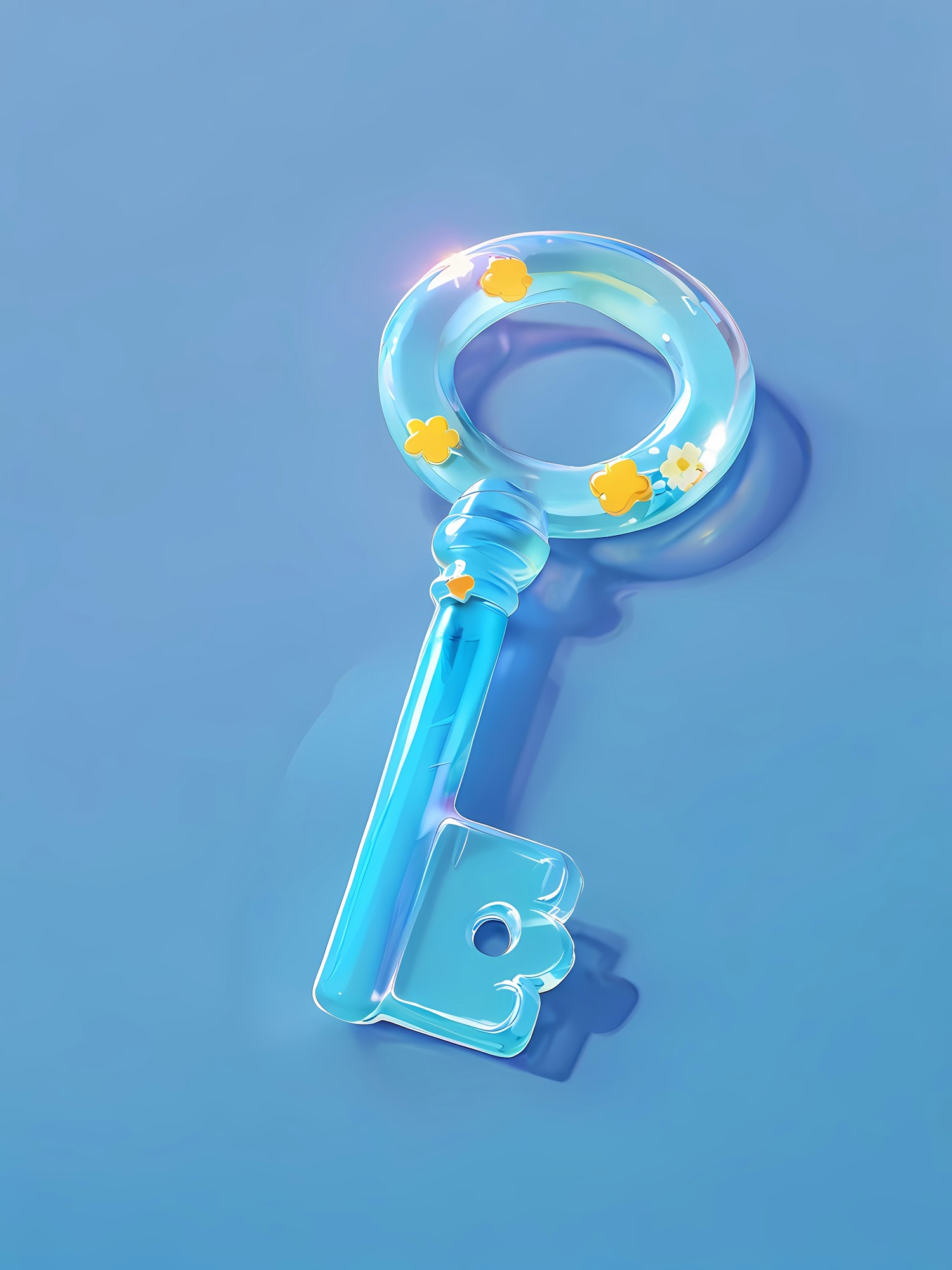 A magical glass-like key with floral accents on a light blue background, perfect for fantasy or whimsical design themes.