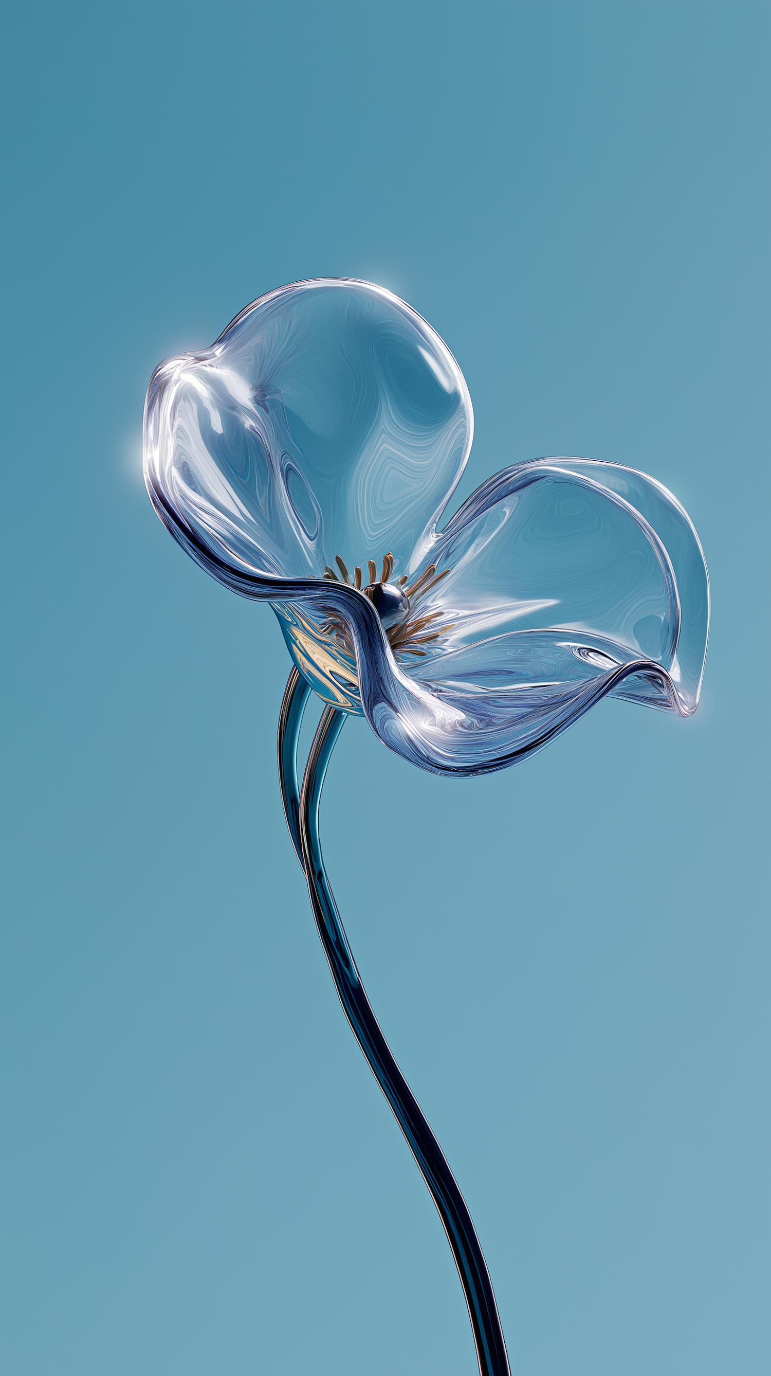 A stunning digital rendering of a glass-like flower with metallic accents against a clean blue background, blending nature and modern design.