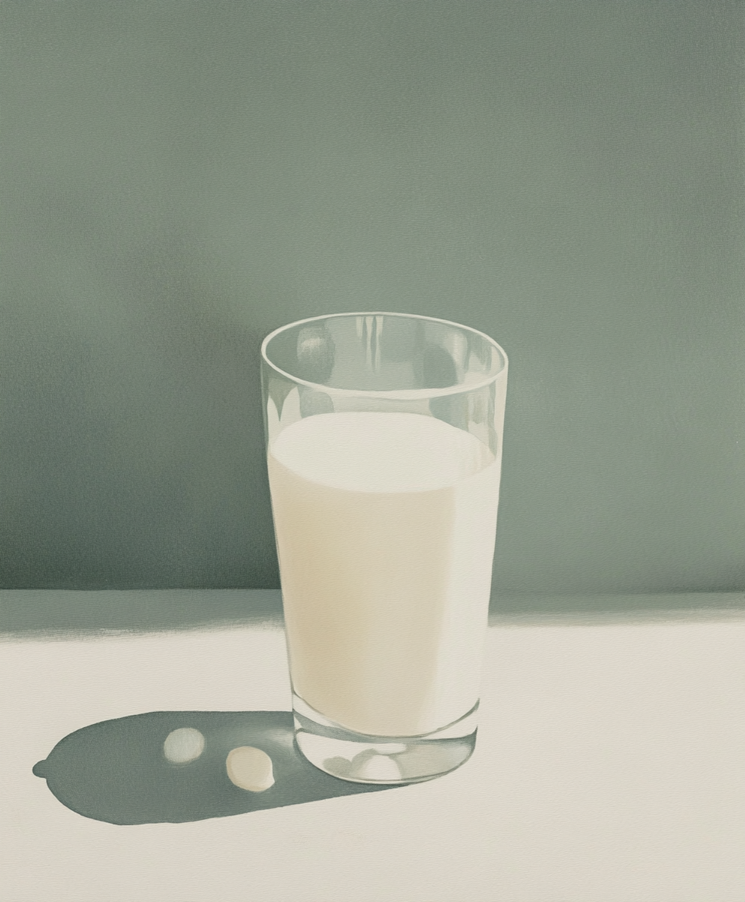 Minimalist illustration of a glass of milk with a muted green background and subtle lighting.