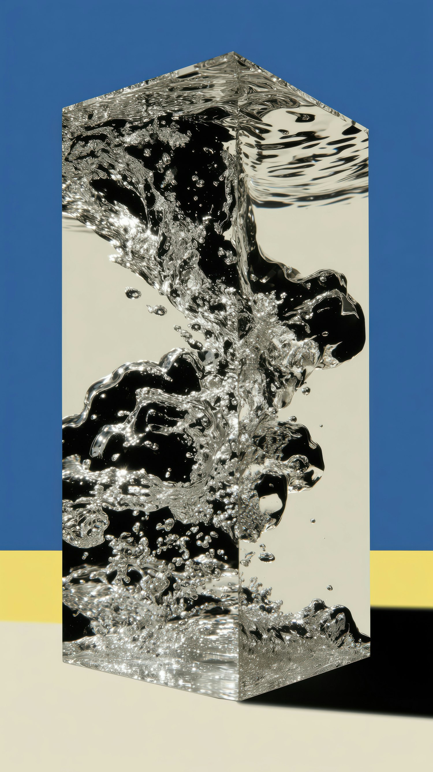 A transparent prism with swirling water inside, set against a bold blue, yellow, and beige background. Modern and dynamic design.