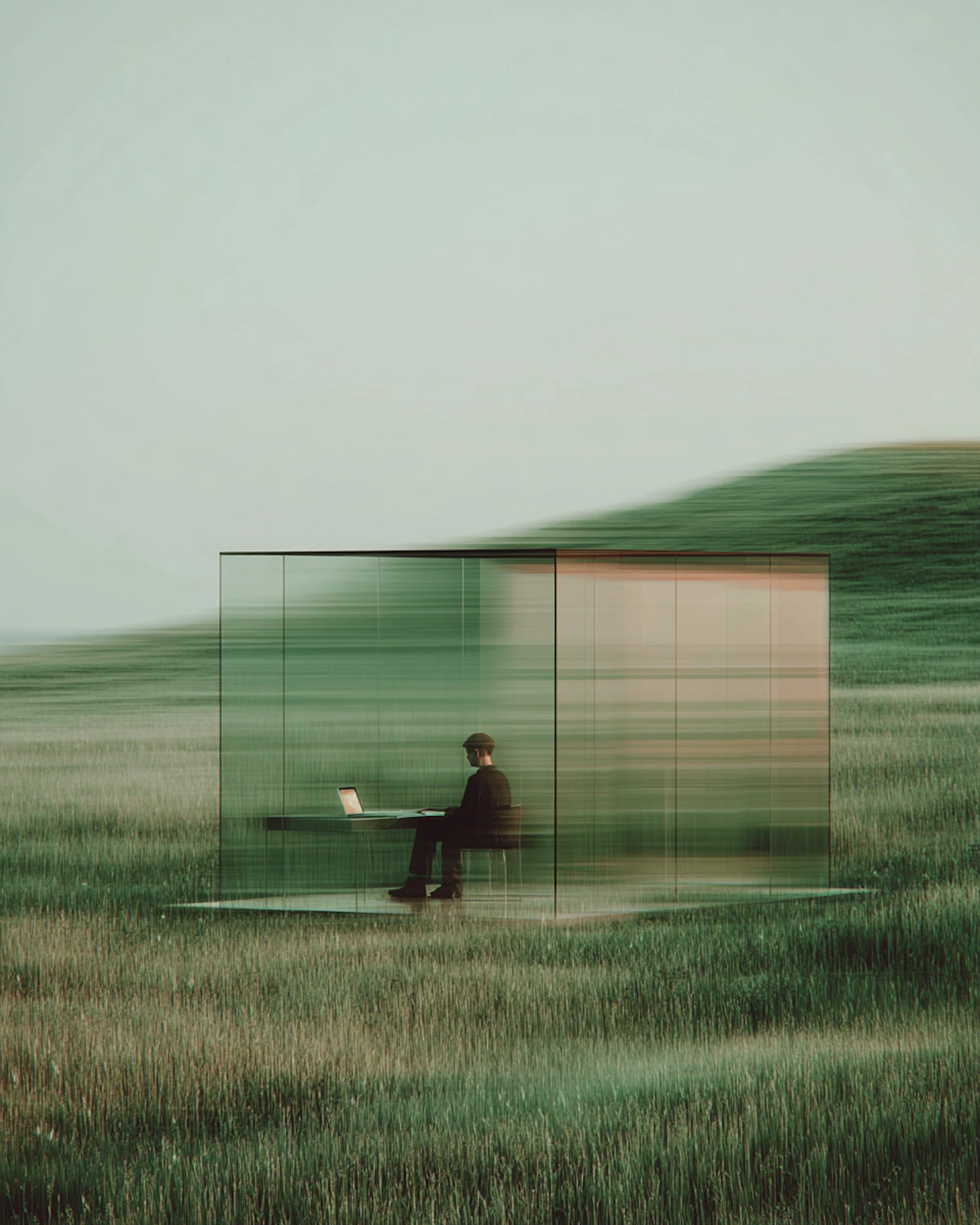 A modern glass structure in a green field with a person working inside, blending architecture and nature in a serene setting.