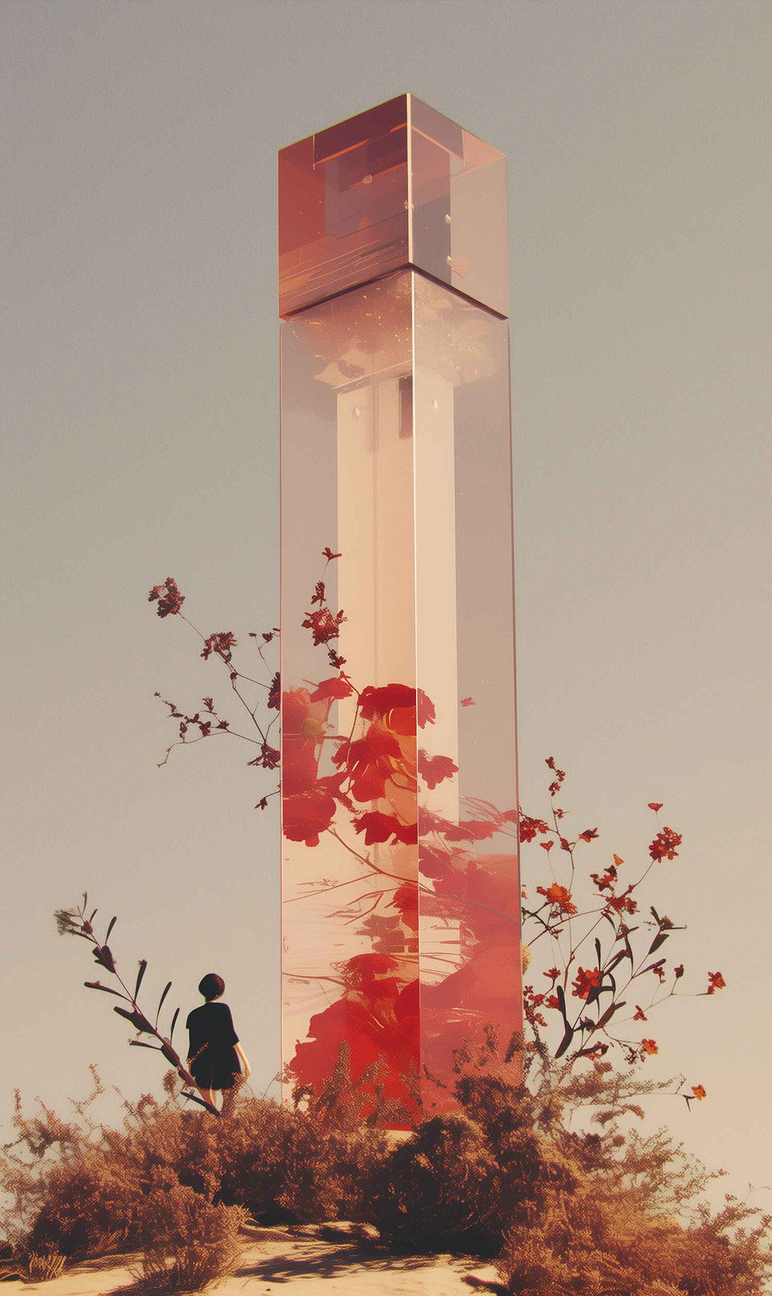 A person gazes at a tall, transparent structure with red flowers inside, set in a desert landscape under a clear sky.