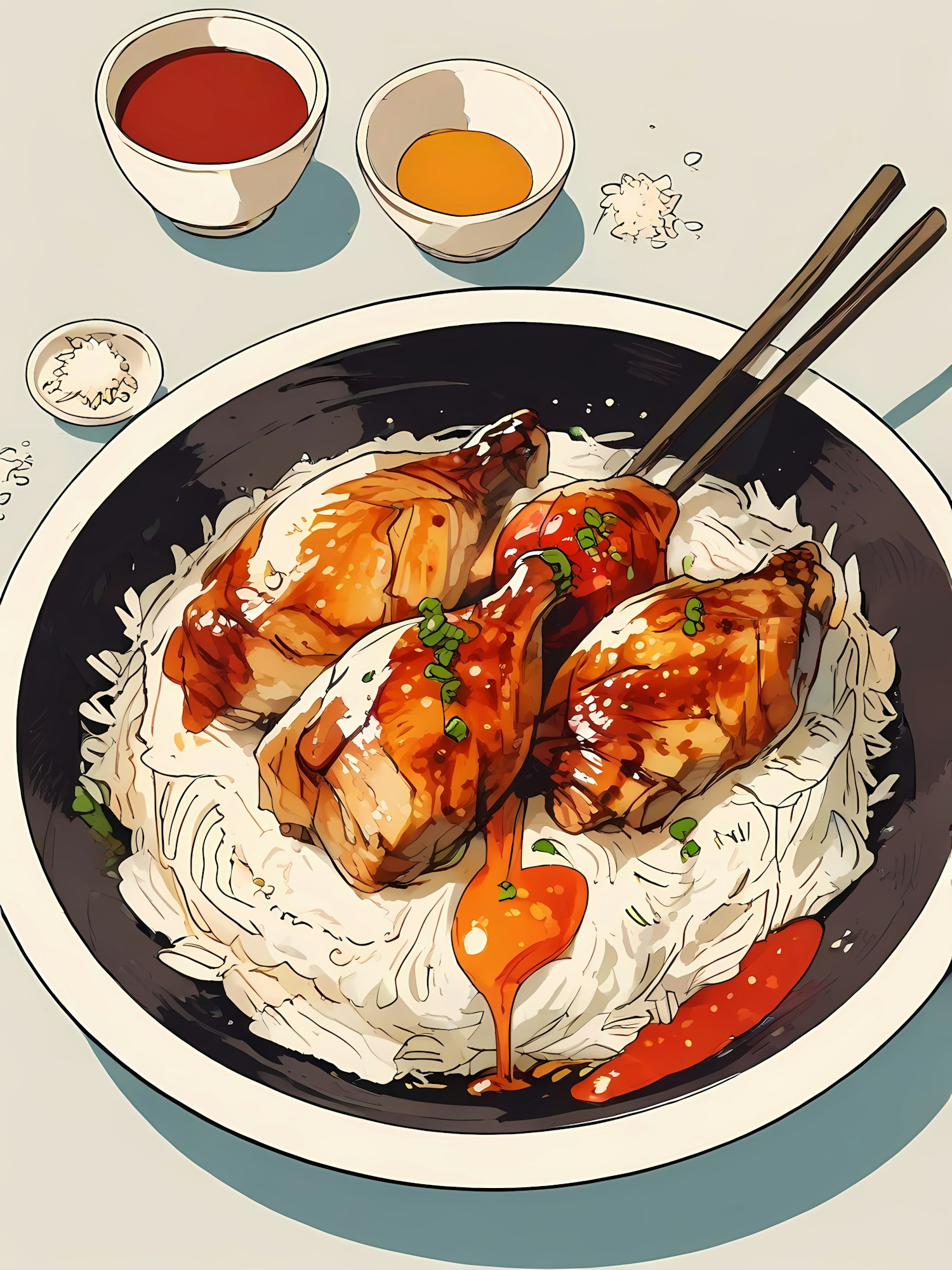 Illustrated dish of glazed chicken on noodles with sauces, garnished with green onions and chopsticks, creating a vibrant culinary scene.