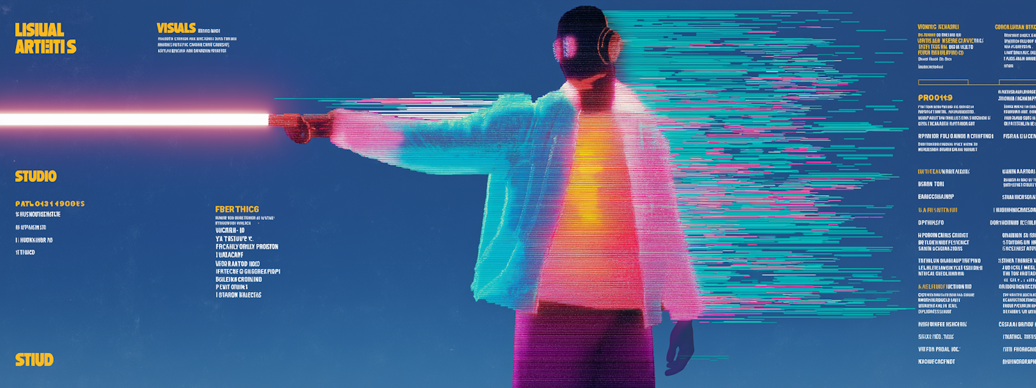 A vibrant glitch art style image of a figure with a glowing beam, set against a blue background with colorful text elements.