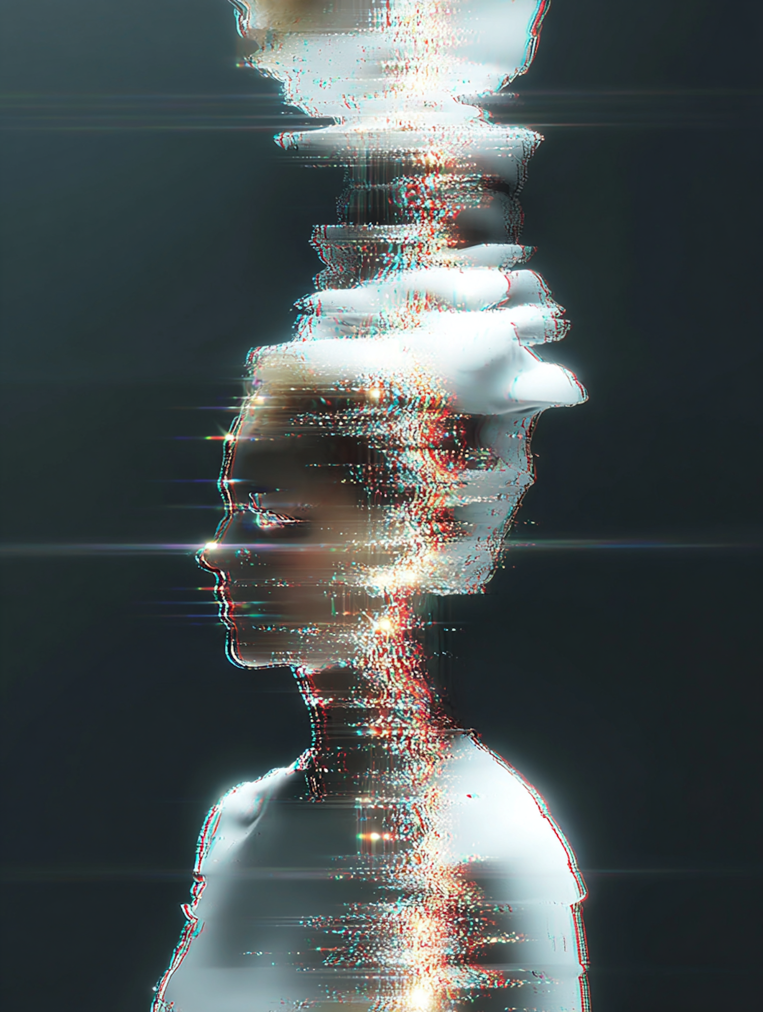 A surreal digital artwork of a human profile dissolving into light and particles, set against a dark background.