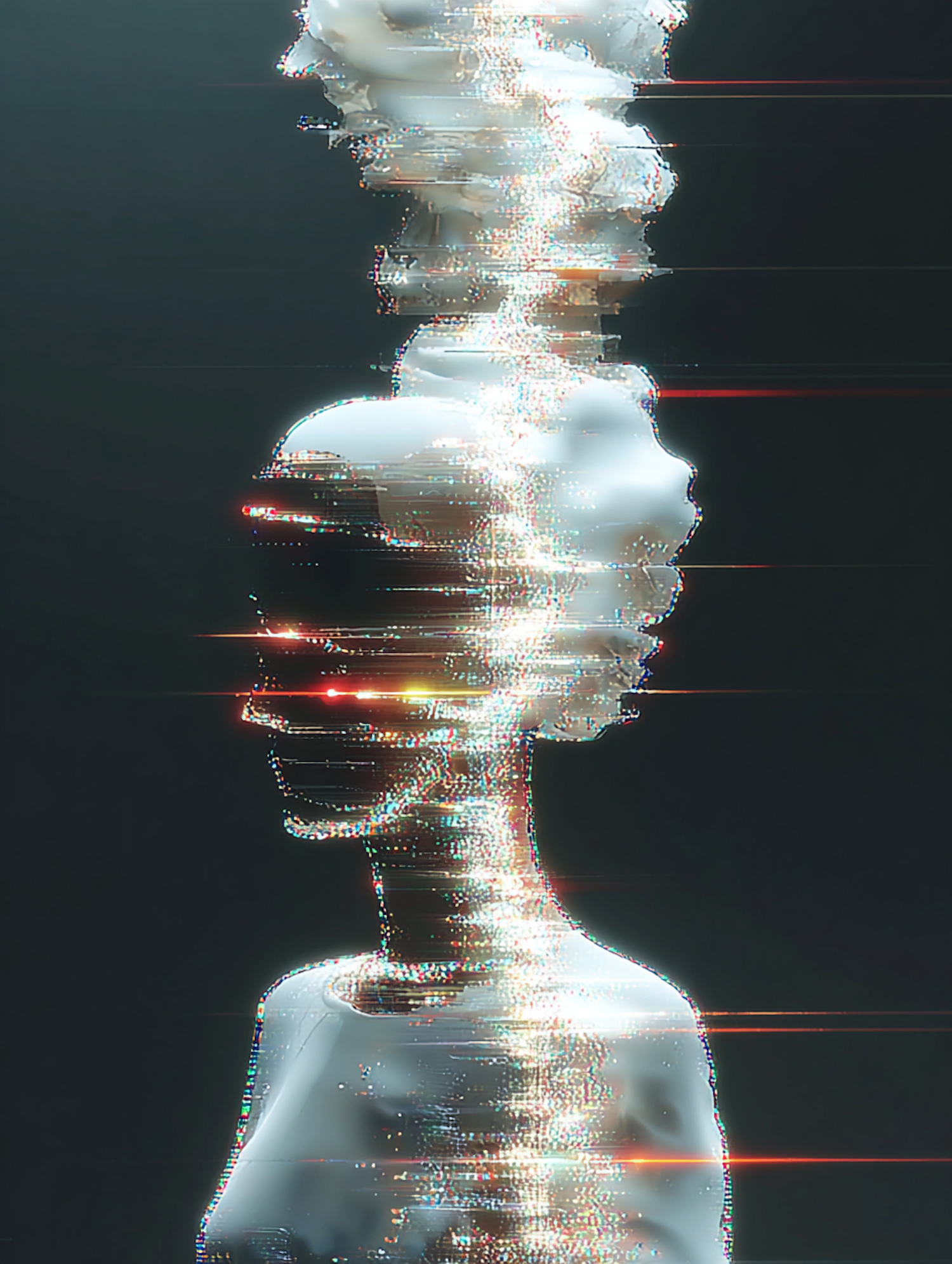 A surreal digital artwork of a humanoid figure with glitch-like textures and glowing particles, set against a dark background.