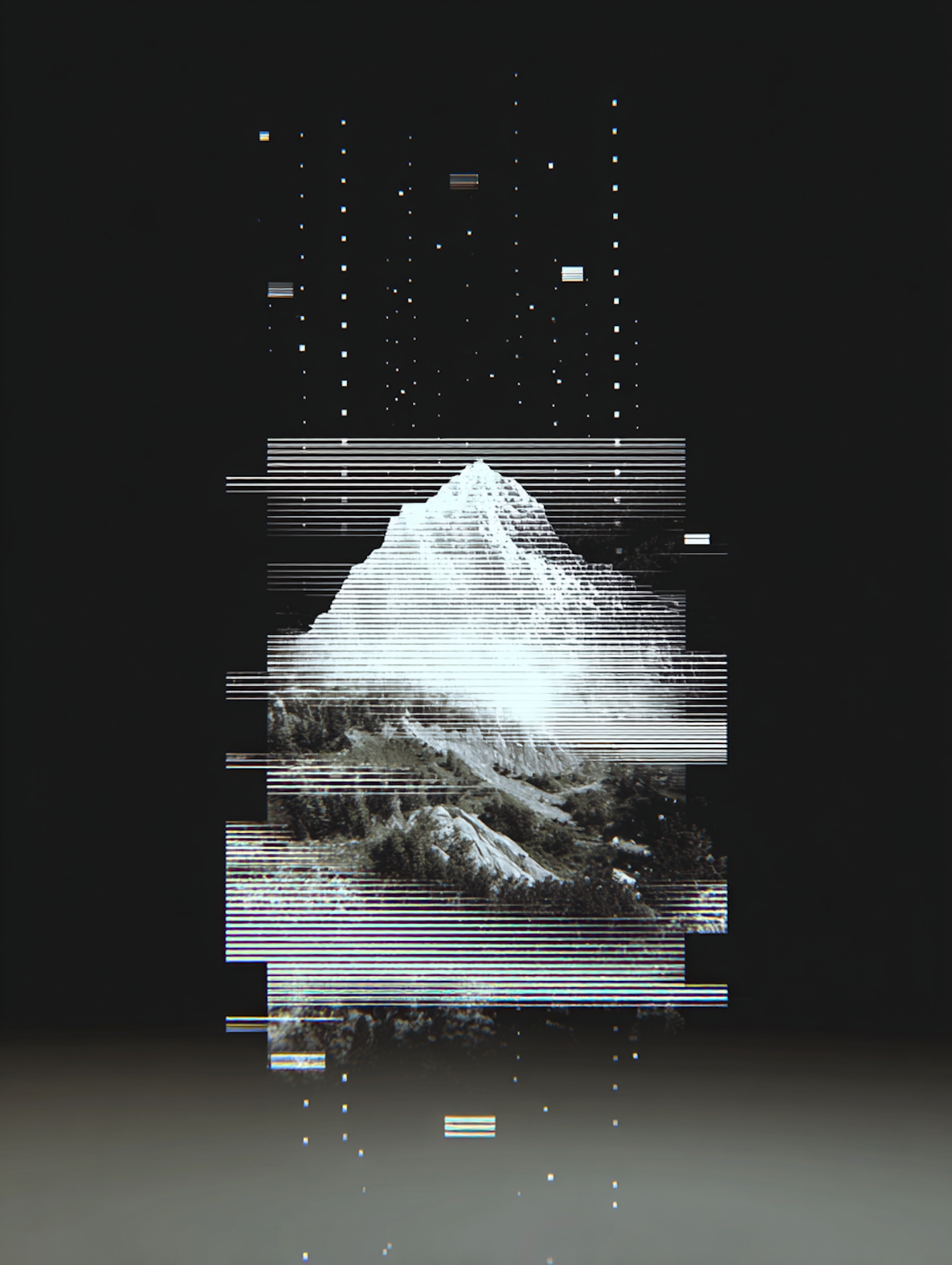 A glitch art depiction of a mountain, blending natural scenery with digital abstraction in a striking and modern composition.
