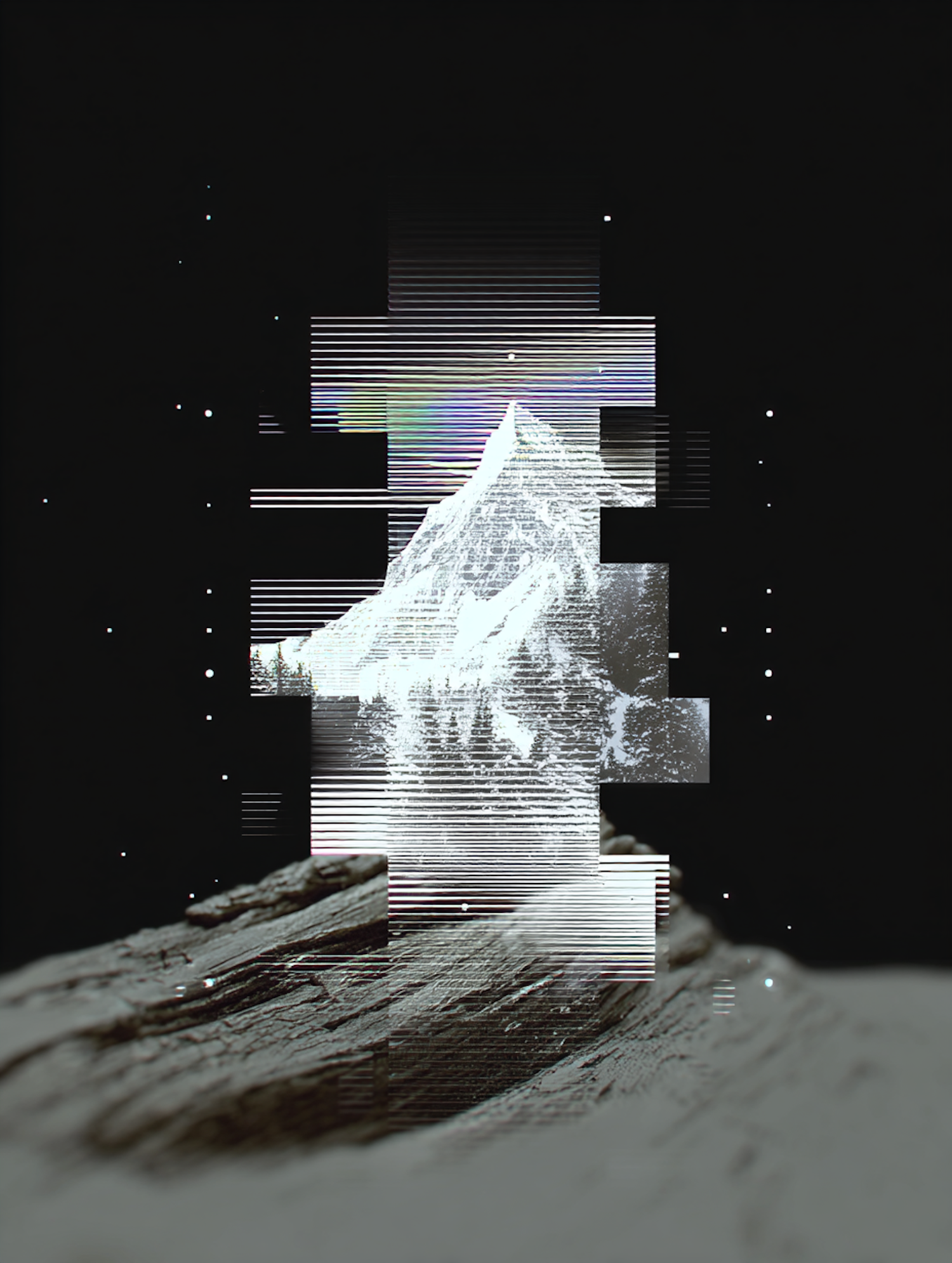 A surreal digital artwork of a mountain peak with glitch effects, blending natural and digital elements against a dark background.
