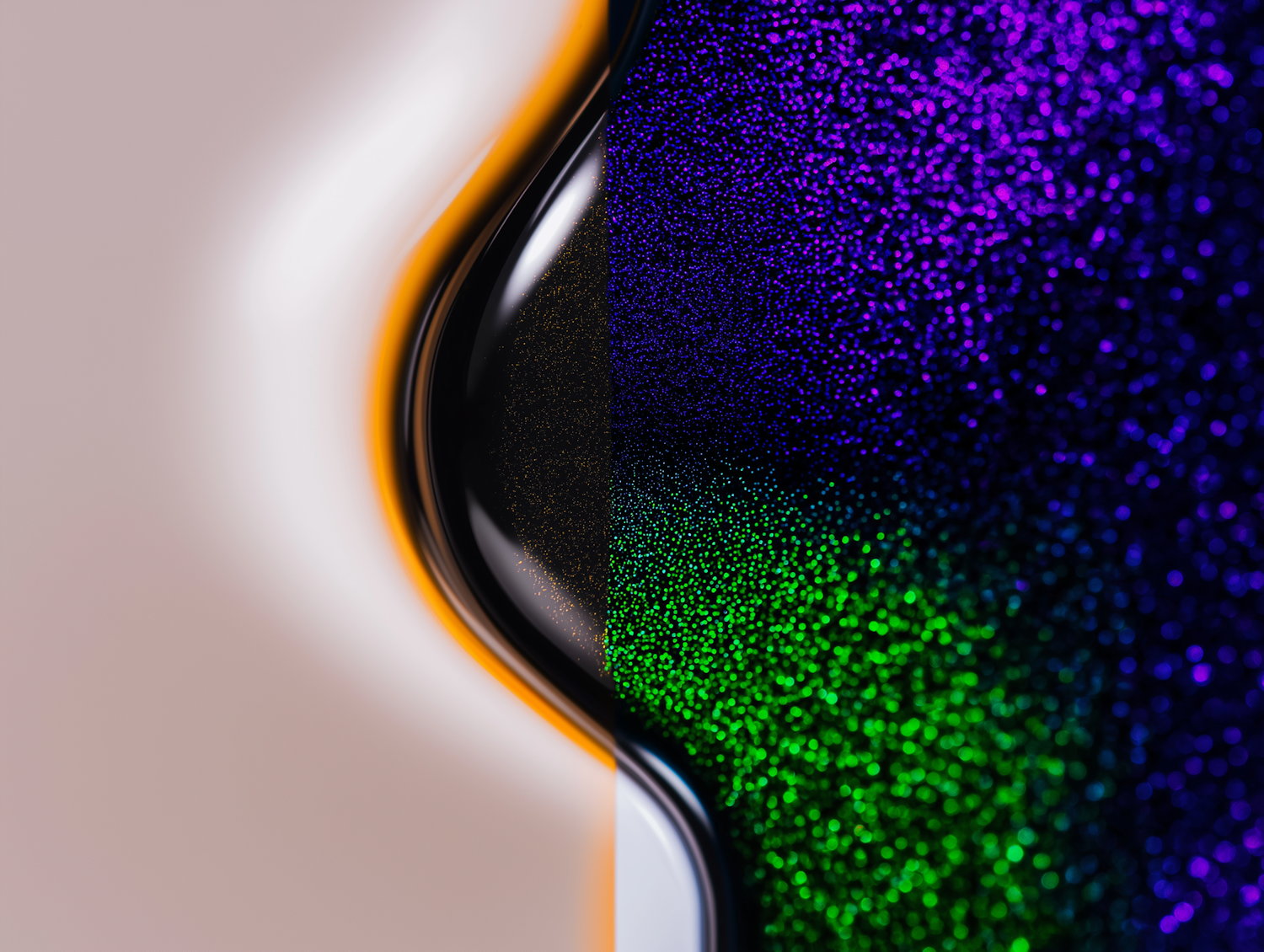 Abstract close-up of a glossy surface with vibrant purple-to-green gradient and textured glittery details, creating a striking visual contrast.