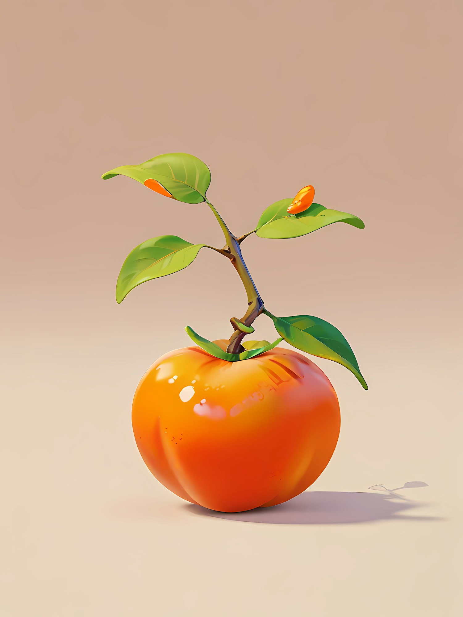 A glossy orange fruit with green leaves on a branch, set against a soft beige background. Minimalistic and vibrant digital illustration.