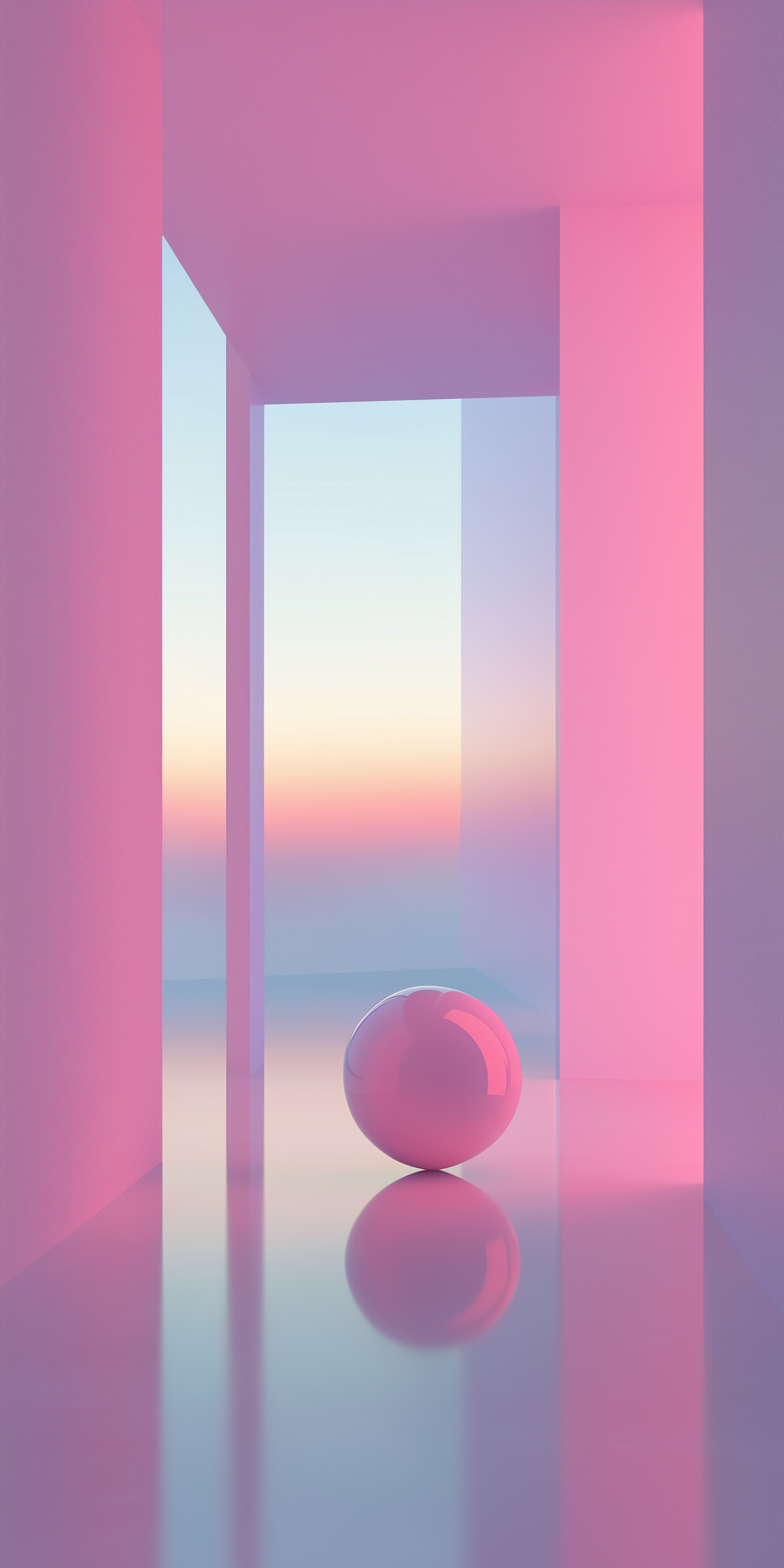 A serene 3D scene with a glossy pink sphere on a reflective surface, surrounded by pastel walls and a gradient sky in soft hues.