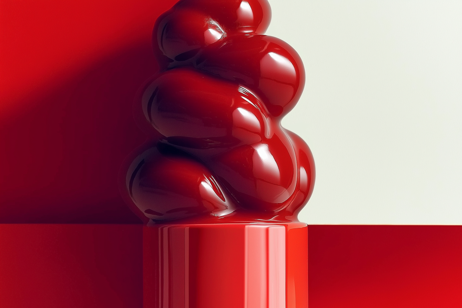 Glossy red abstract sculpture against a bold red and white background, featuring smooth, bulbous forms and reflective surfaces.
