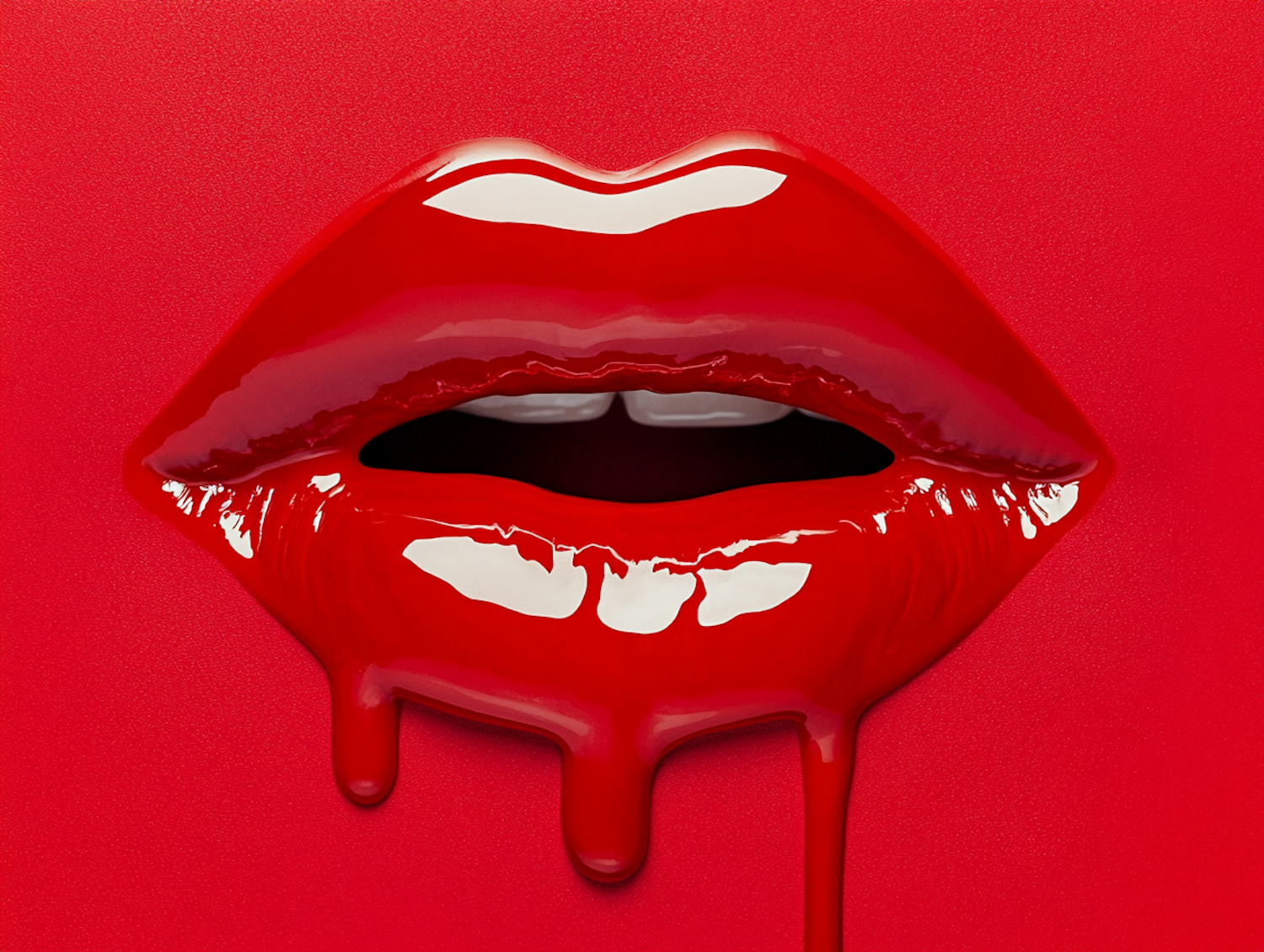 Glossy red lips with dripping lipstick on a vibrant red background, creating a bold and artistic visual effect.