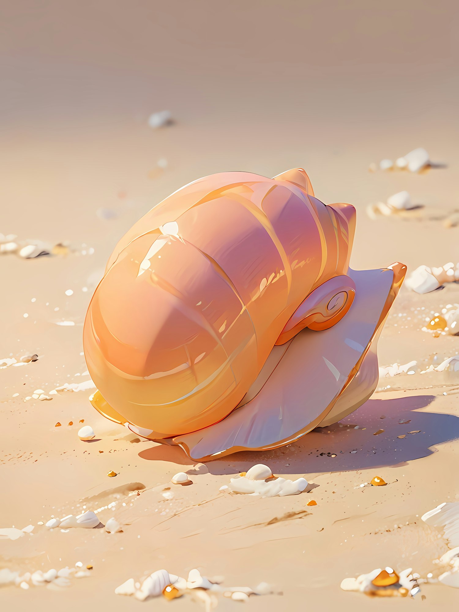 A glossy peach seashell on soft beige sand, surrounded by scattered white and golden pebbles under warm, serene lighting.