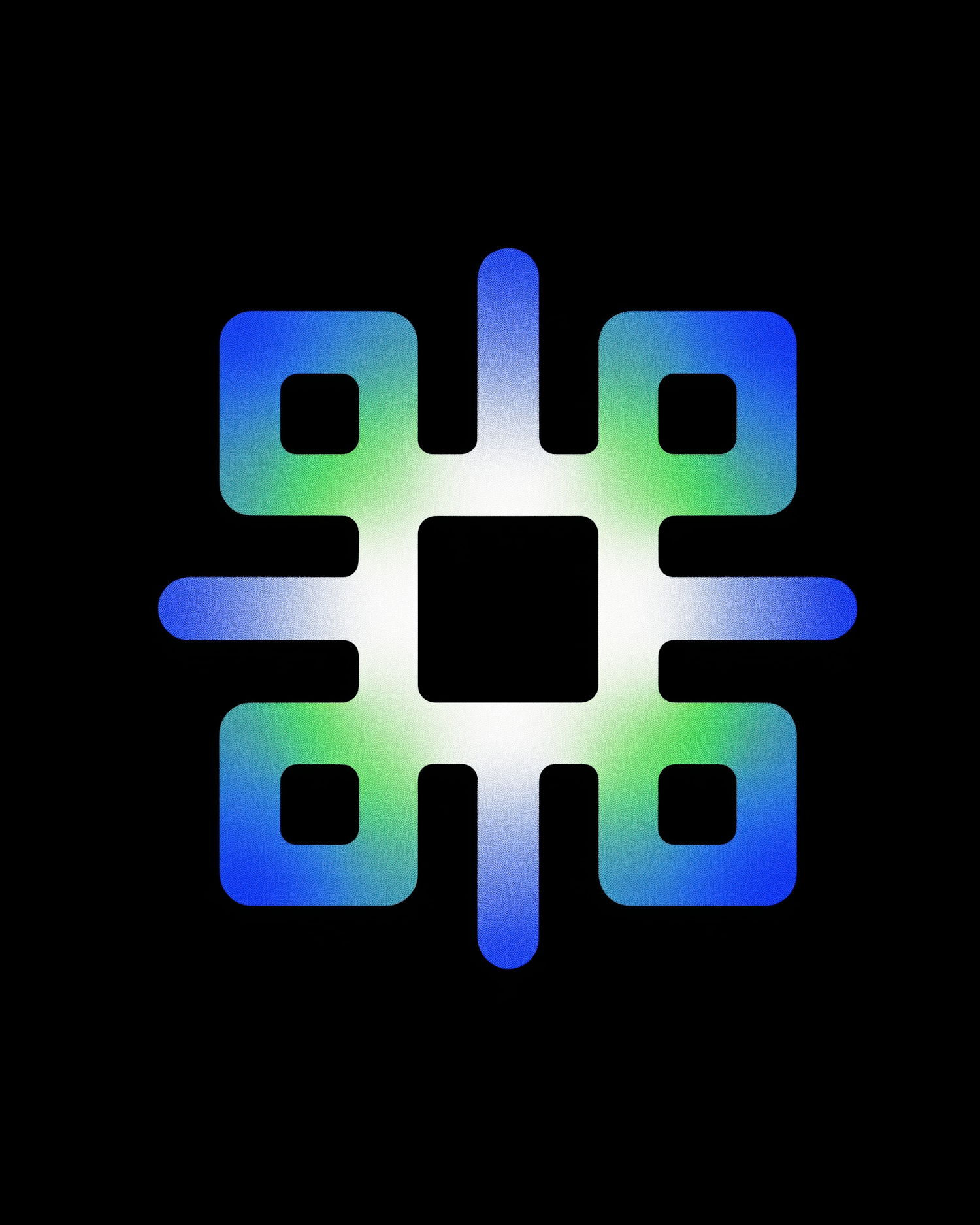 Abstract glowing geometric design with blue and green gradient on a black background, creating a futuristic and digital vibe.