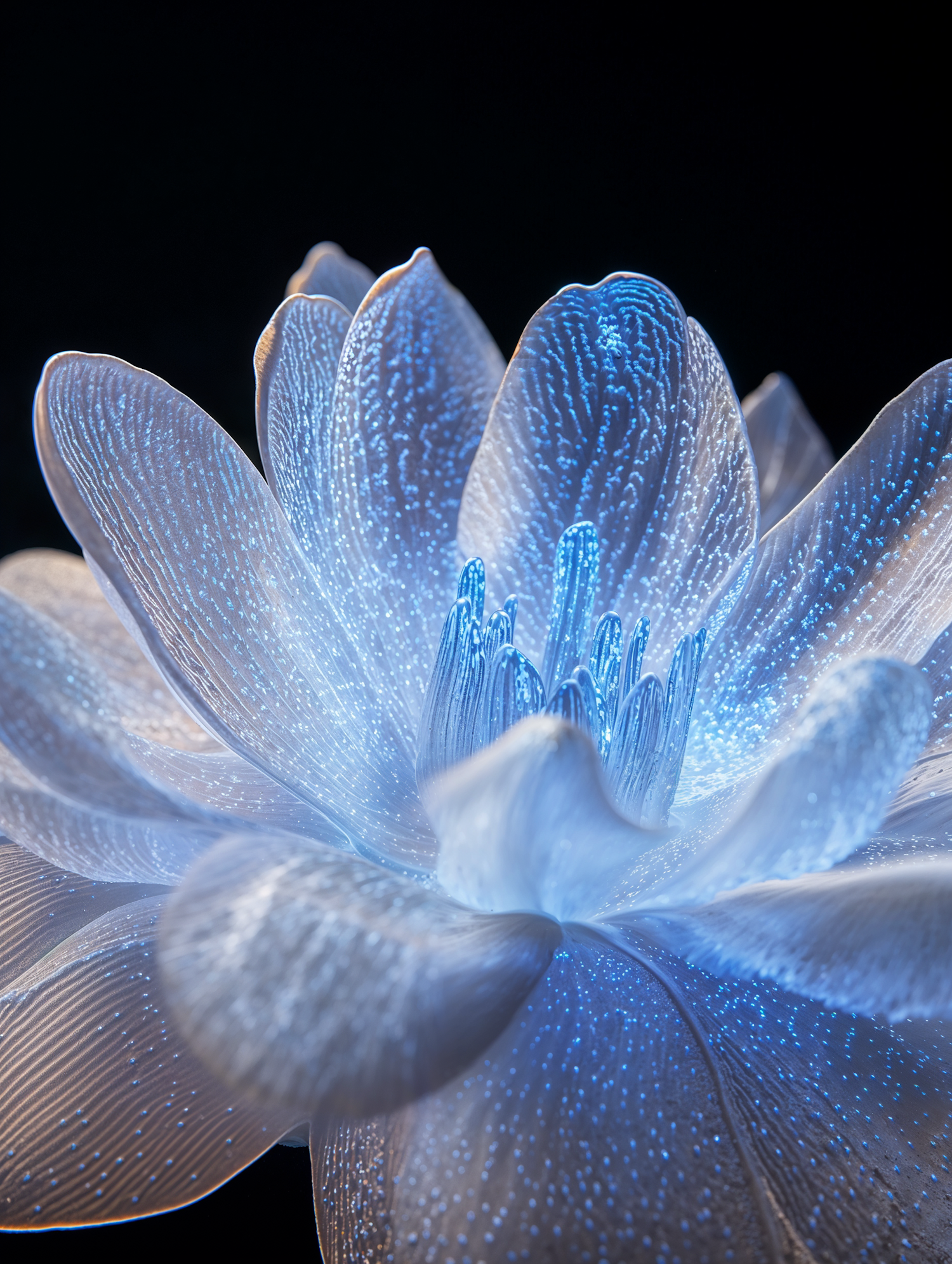 A glowing, translucent flower with blue bioluminescent accents against a black background, creating a magical and ethereal effect.
