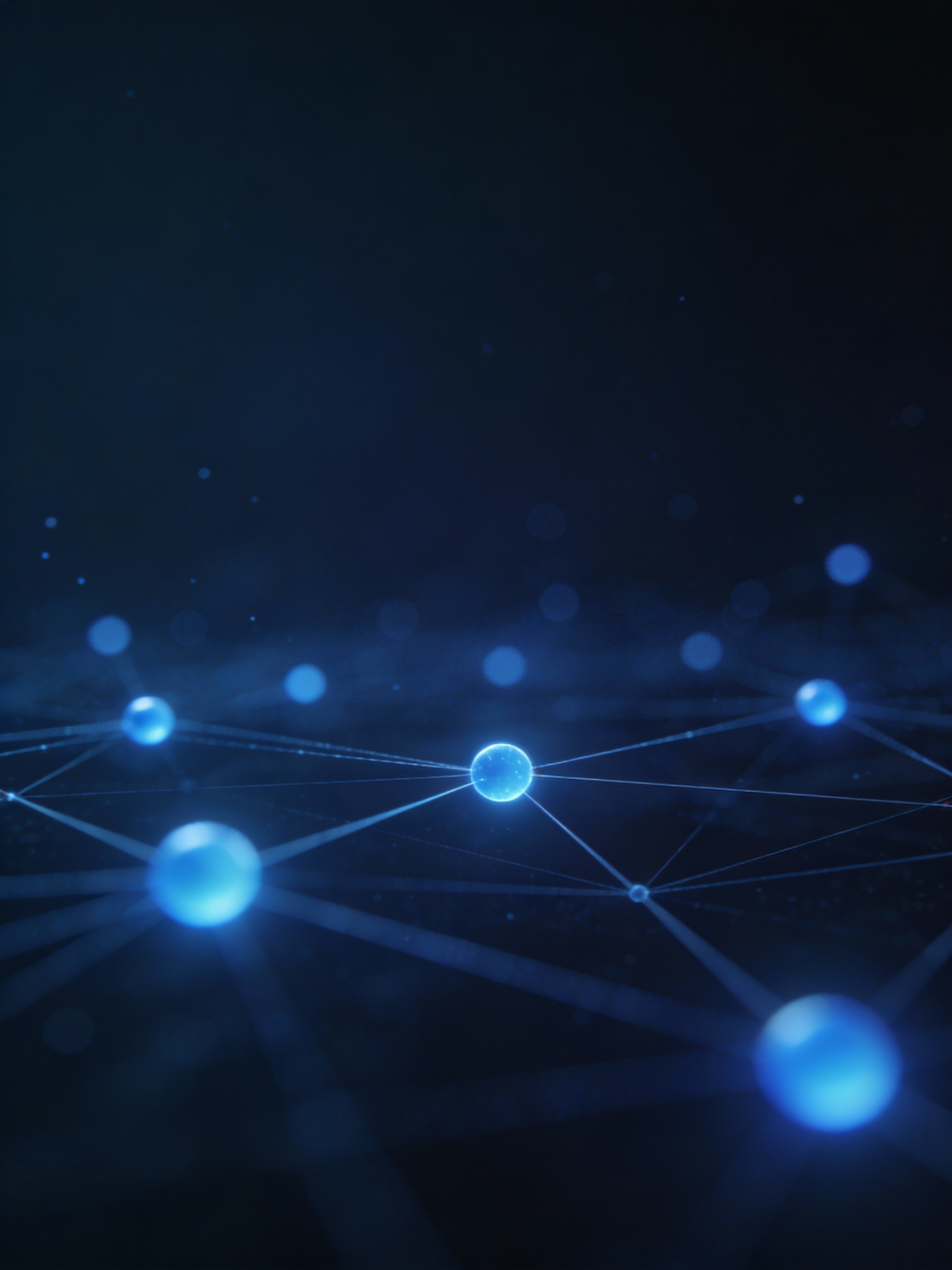 Minimal connected node graph, sparse dots and faint lines, deep navy background, cool blue glow, high-end enterprise look, soft haze, spacious composition, no text, no logo — --ar 3:4
