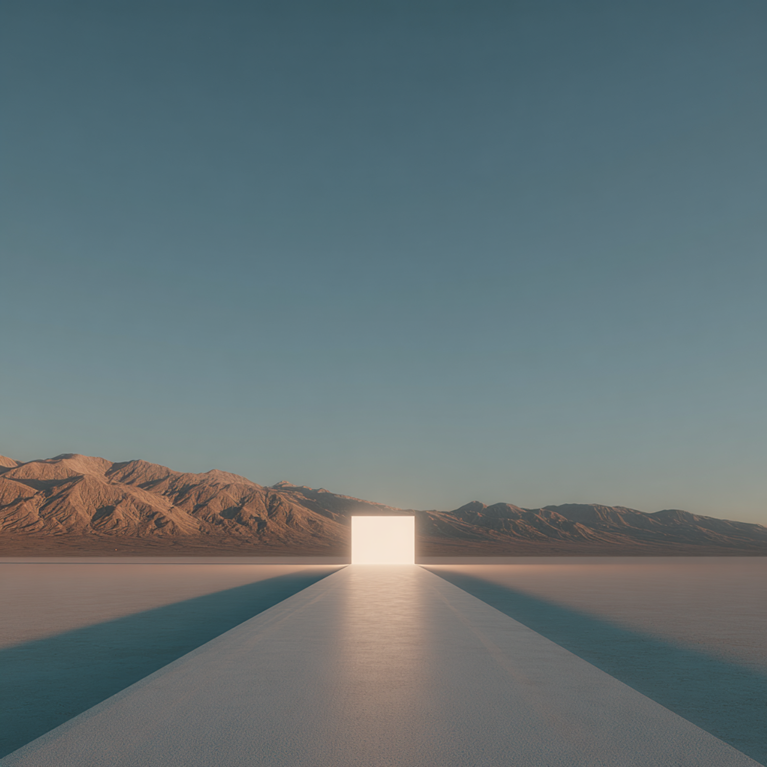 A glowing white cube in a vast landscape with a pathway leading to it, surrounded by mountains under a clear blue sky.