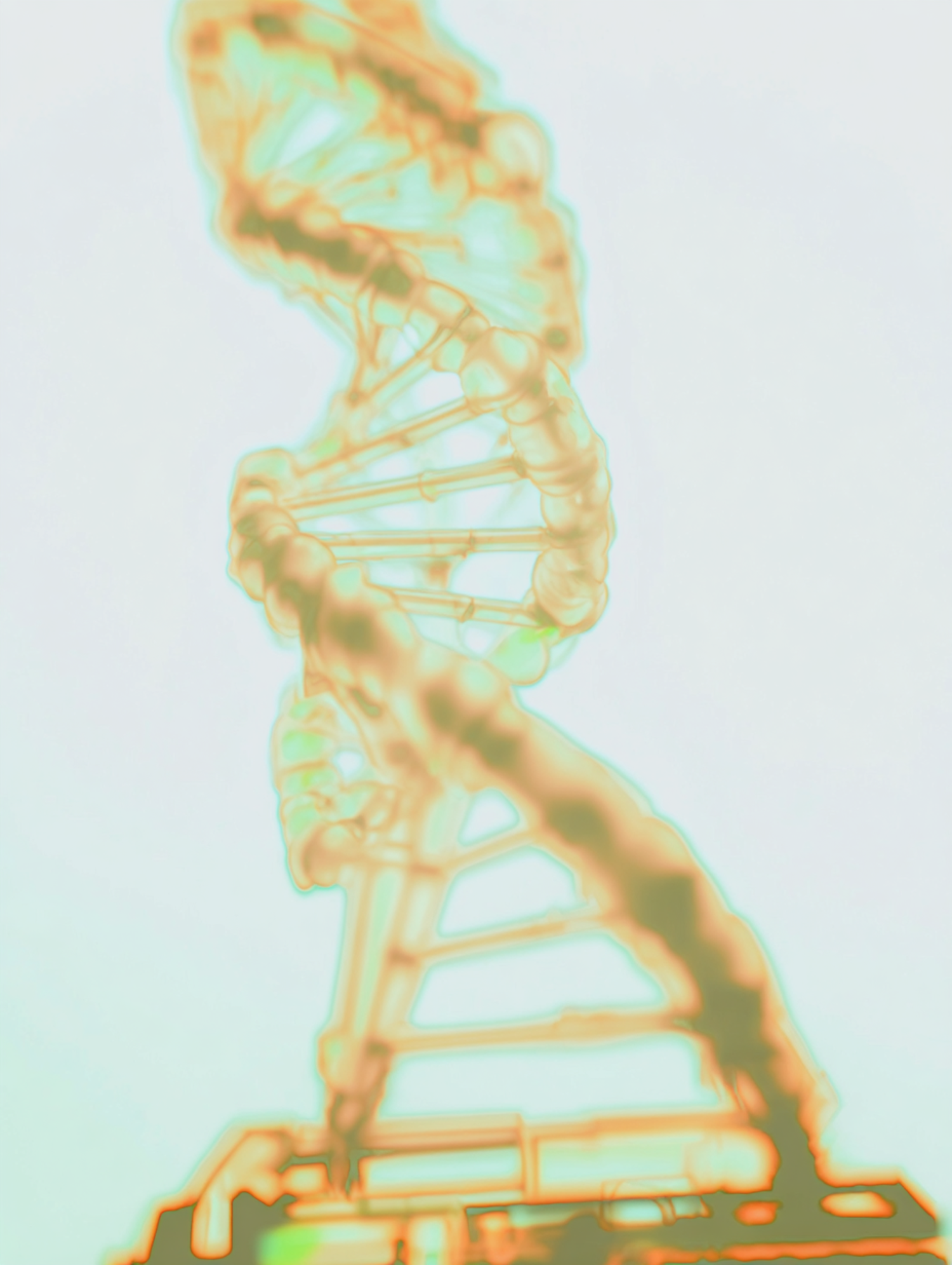 A glowing artistic depiction of a DNA double helix in orange and green hues, showcasing its intricate molecular structure.