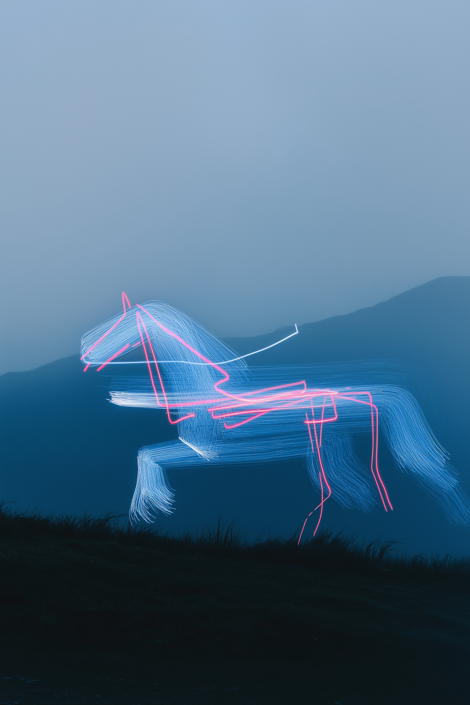 A glowing horse outline made of blue and pink light trails against a misty mountain backdrop, creating a surreal and artistic scene.