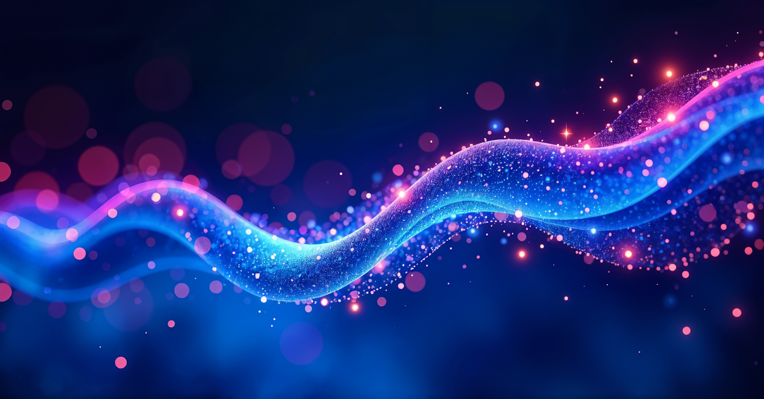 Glowing abstract wave of light in blue, pink, and purple with sparkling particles and bokeh lights on a deep blue background.