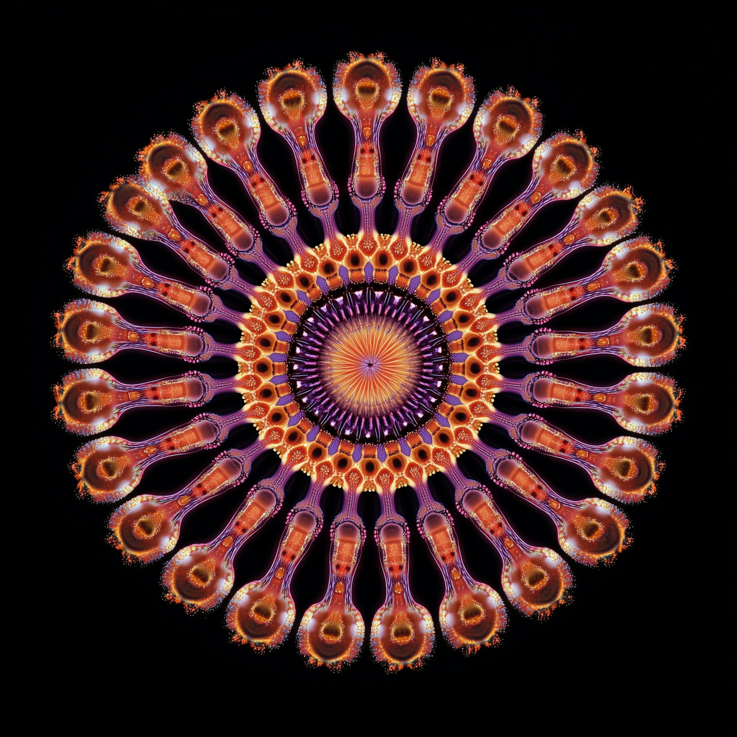 A glowing mandala-like design with intricate orange, purple, and yellow patterns, set against a black background for a striking visual effect.