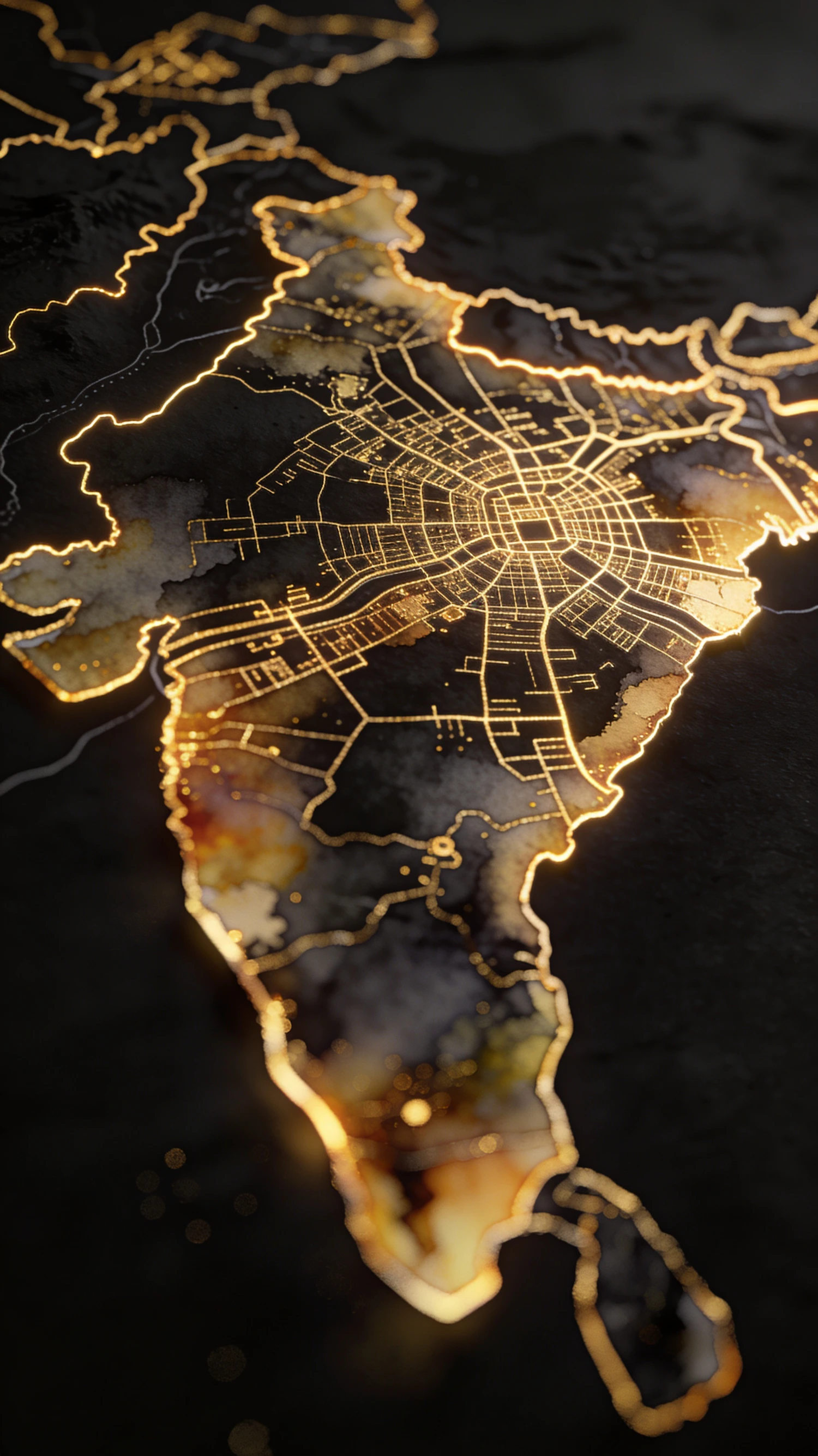 A glowing, artistic map of India with golden lines highlighting cities and borders against a dark background.