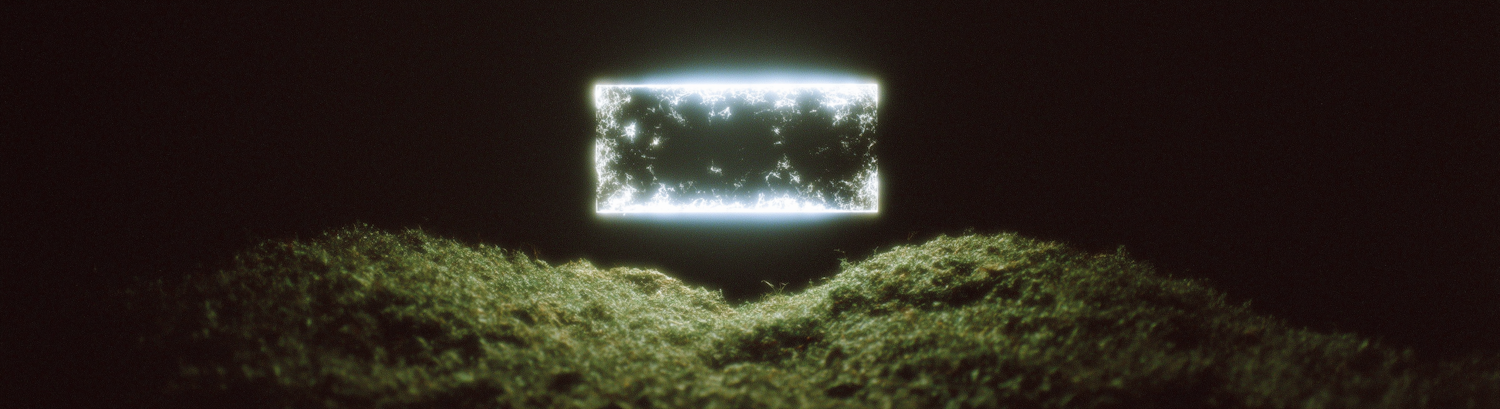 A glowing rectangle illuminates a mossy ground in a dark, mysterious setting, creating an ethereal and captivating visual contrast.