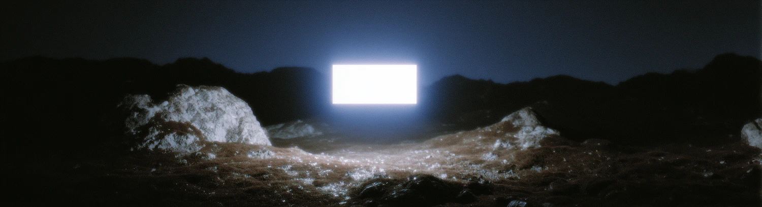 A glowing rectangle illuminates a dark, rocky landscape, creating a mysterious and surreal atmosphere.