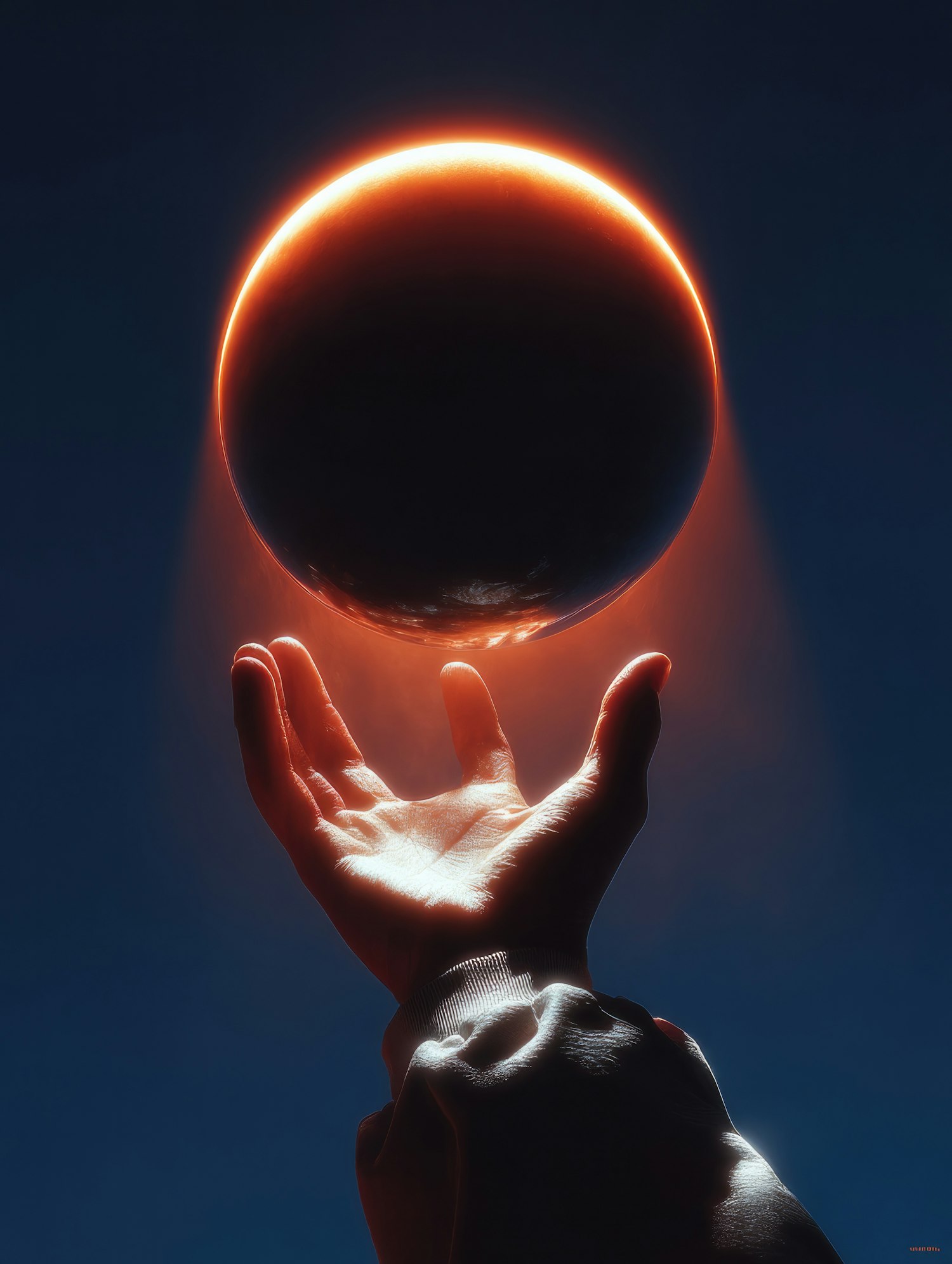 A glowing, mysterious dark sphere hovered above an outstretched hand, its faint red light painting a cosmic scene against a blue gradient.