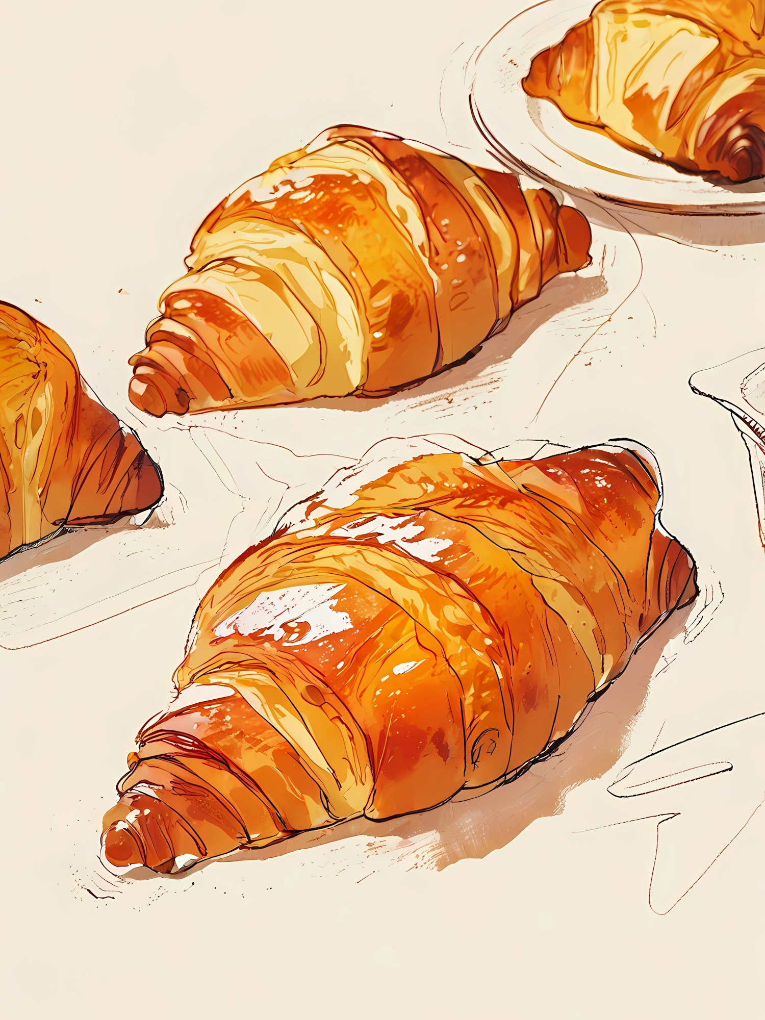 Illustration of golden brown croissants with a glossy finish, showcasing their flaky texture on a light background.