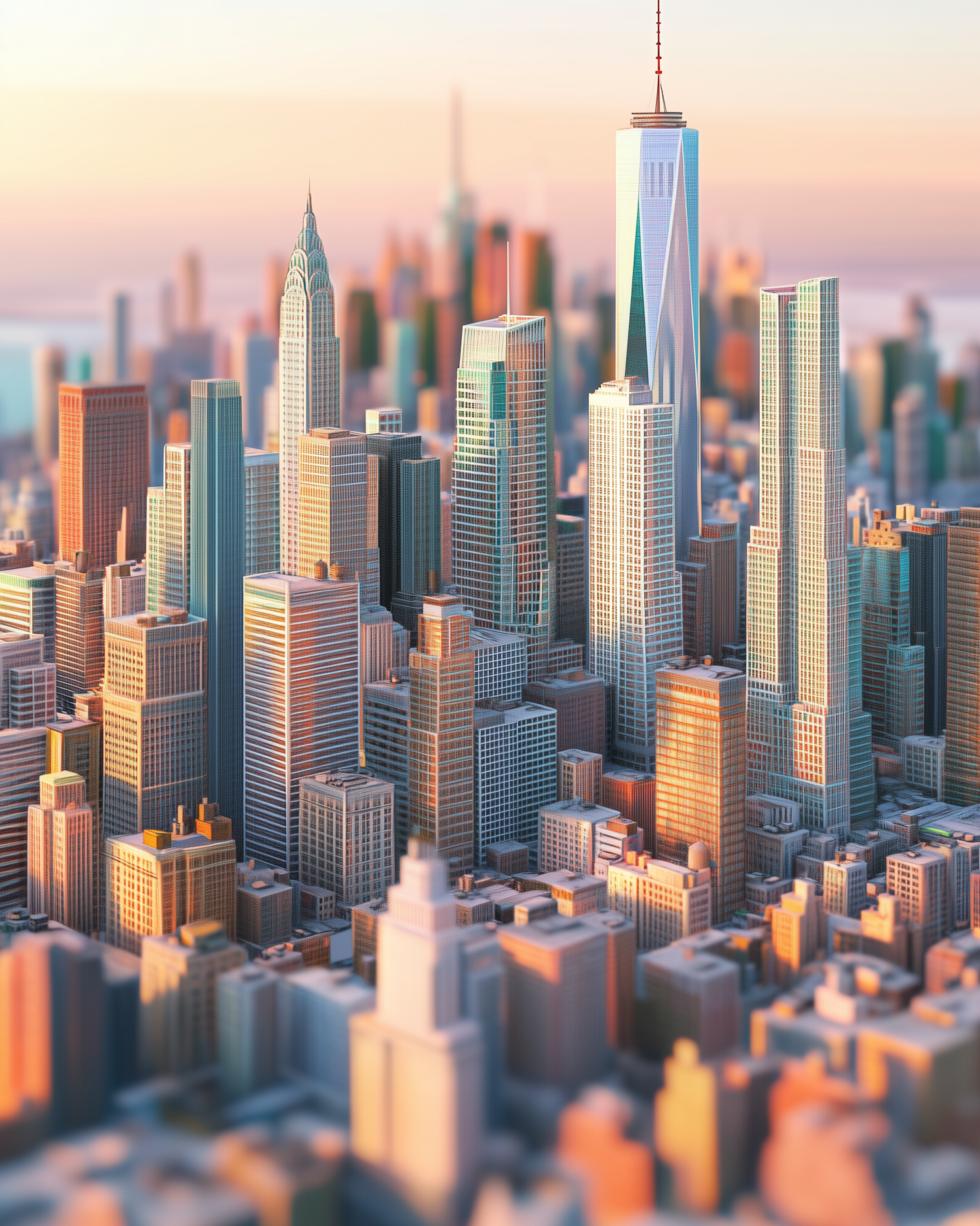 A stunning cityscape with iconic skyscrapers, including the Chrysler Building, glowing in warm sunlight against a pastel horizon.