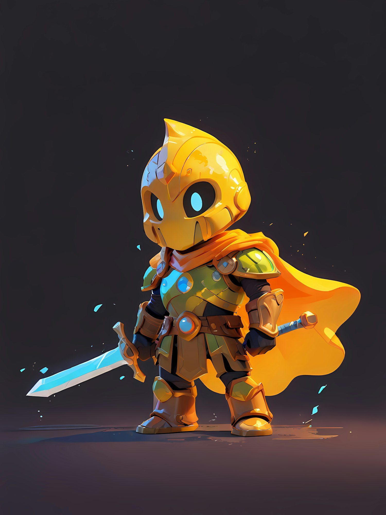A cartoon knight in golden armor with glowing blue eyes and sword, wearing a yellow cape, standing heroically on a dark background.