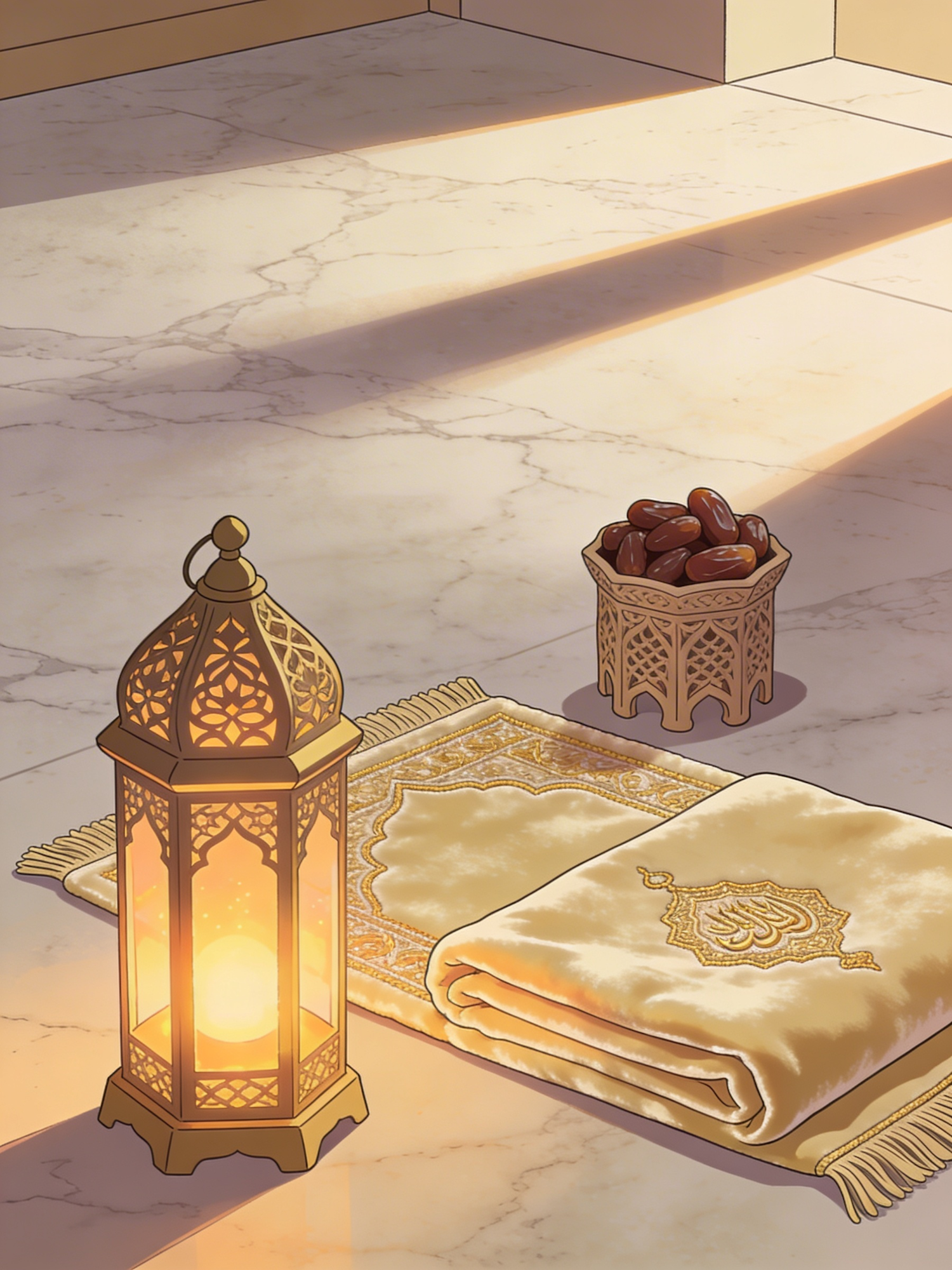 A glowing lantern, a golden prayer mat, and a bowl of dates on a marble floor, bathed in soft sunlight, creating a serene ambiance.