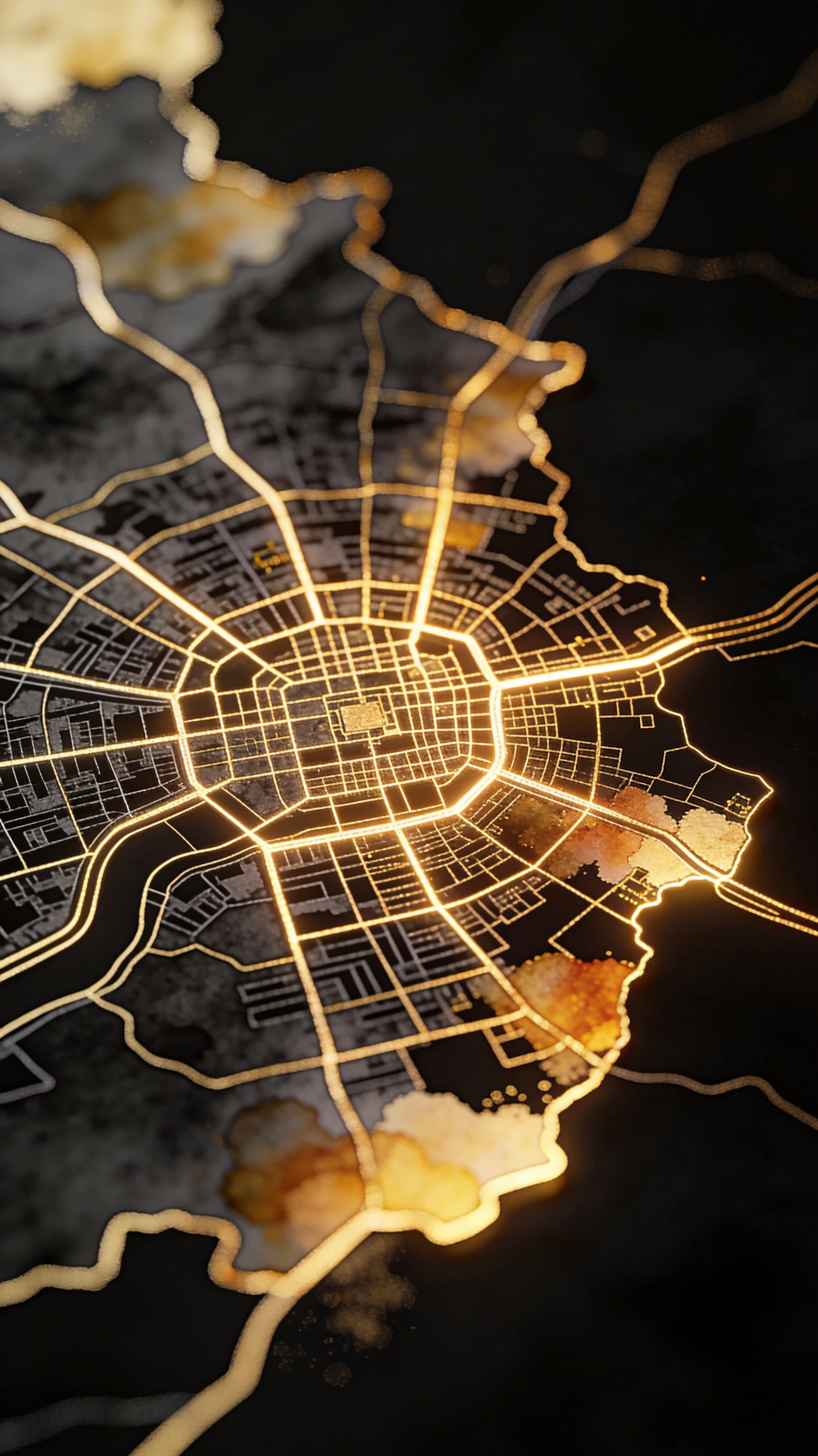 A glowing golden map design with intricate street patterns on a dark textured background, creating a modern and artistic look.